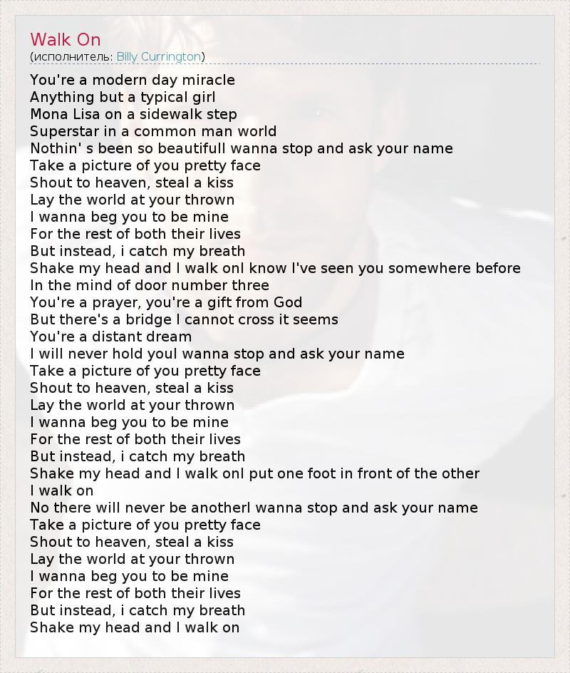You're a modern day miracle Anything but a typical girl Mona Lisa on a sidewalk step Superstar in a common man world Nothin' s been so beautifulI wanna stop and ask your name Take a picture of you pretty face Shout to heaven, steal a kiss Lay the world at your thrown I wanna beg you to be mine For the rest of both their lives But instead, i catch my breath Shake my head and I walk onI know I've seen you somewhere before In the mind of door number three You're a prayer, you're a gift from God But there's a bridge I cannot cross it seems You're a distant dream I will never hold youI wanna stop and ask your name Take a picture of you pretty face Shout to heaven, steal a kiss Lay the world at your thrown I wanna beg you to be mine For the rest of both their lives But instead, i catch my breath Shake my head and I walk onI put one foot in front of the other I walk on No there will never be anotherI wanna stop and ask your name Take a picture of you pretty face Shout to heaven, steal a kiss Lay the world at your thrown I wanna beg you to be mine For the rest of both their lives But instead, i catch my breath Shake my head and I walk on