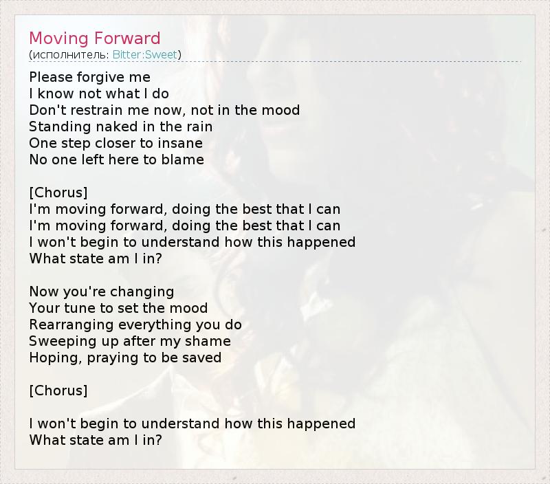 Please forgive me I know not what I do Don't restrain me now, not in the mood Standing naked in the rain One step closer to insane No one left here to blame [Chorus] I'm moving forward, doing the best that I can I'm moving forward, doing the best that I can I won't begin to understand how this happened What state am I in? Now you're changing Your tune to set the mood Rearranging everything you do Sweeping up after my shame Hoping, praying to be saved [Chorus] I won't begin to understand how this happened What state am I in?
