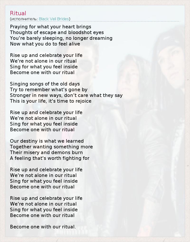 Это интересно:Группа исполняет глэм-метал\мелодик пост-хардкор.Black Veil Brides (рус. Невесты в черных вуалях) — американская рок-группа, основанная в 2006 году, Голливуд, штат Калифорния. Первоначально группа носила название «Brides» и в нее входили вокалист Энди Бирсак, гитарист Джонни Герольд и бас-гитарист Филл Кенеделла, вдохновленные такими группами, как Kiss, Mötley Crüe и другими артистами... продолжение