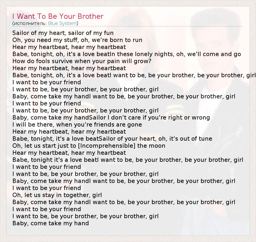 Sailor of my heart, sailor of my fun Oh, you need my stuff, oh, we're born to run Hear my heartbeat, hear my heartbeat Babe, tonight, oh, it's a love beatIn these lonely nights, oh, we'll come and go How do fools survive when your pain will grow? Hear my heartbeat, hear my heartbeat Babe, tonight, oh, it's a love beatI want to be, be your brother, be your brother, girl I want to be your friend I want to be, be your brother, be your brother, girl Baby, come take my handI want to be, be your brother, be your brother, girl I want to be your friend I want to be, be your brother, be your brother, girl Baby, come take my handSailor I don't care if you're right or wrong I will be there, when you're friends are gone Hear my heartbeat, hear my heartbeat Babe, tonight, it's a love beatSailor of your heart, oh, it's out of tune Oh, let us start just to [Incomprehensible] the moon Hear my heartbeat, hear my heartbeat Babe, tonight it's a love beatI want to be, be your brother, be your brother, girl I want to be your friend I want to be, be your brother, be your brother, girl Baby, come take my handI want to be, be your brother, be your brother, girl I want to be your friend Oh, let us stay in together, girl Baby, come take my handI want to be, be your brother, be your brother, girl I want to be your friend I want to be, be your brother, be your brother, girl Baby, come take my hand