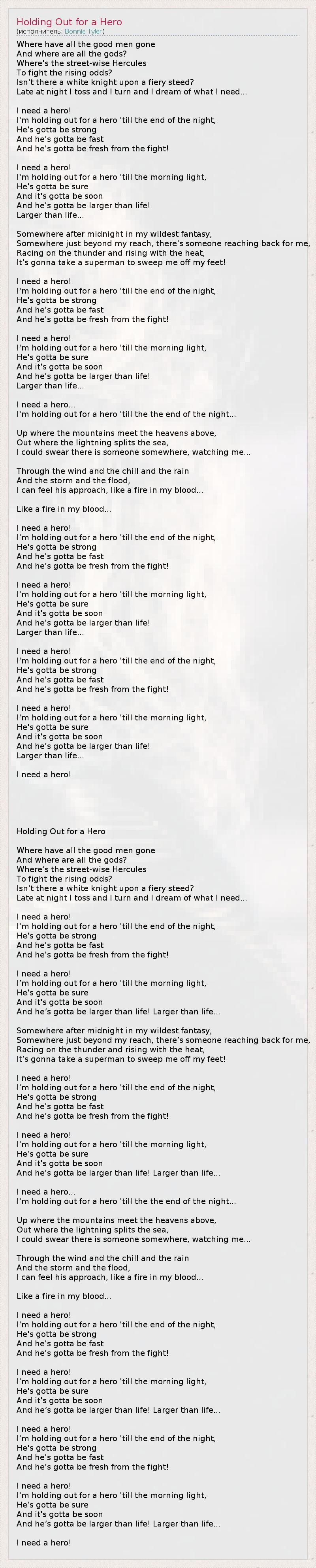 Where have all the good men gone And where are all the gods? Where's the street-wise Hercules To fight the rising odds? Isn't there a white knight upon a fiery steed? Late at night I toss and I turn and I dream of what I need... I need a hero! I'm holding out for a hero 'till the end of the night, He's gotta be strong And he's gotta be fast And he's gotta be fresh from the fight! I need a hero! I'm holding out for a hero 'till the morning light, He's gotta be sure And it's gotta be soon And he's gotta be larger than life! Larger than life... Somewhere after midnight in my wildest fantasy, Somewhere just beyond my reach, there's someone reaching back for me, Racing on the thunder and rising with the heat, It's gonna take a superman to sweep me off my feet! I need a hero! I'm holding out for a hero 'till the end of the night, He's gotta be strong And he's gotta be fast And he's gotta be fresh from the fight! I need a hero! I'm holding out for a hero 'till the morning light, He's gotta be sure And it's gotta be soon And he's gotta be larger than life! Larger than life... I need a hero... I'm holding out for a hero 'till the the end of the night... Up where the mountains meet the heavens above, Out where the lightning splits the sea, I could swear there is someone somewhere, watching me... Through the wind and the chill and the rain And the storm and the flood, I can feel his approach, like a fire in my blood... Like a fire in my blood... I need a hero! I'm holding out for a hero 'till the end of the night, He's gotta be strong And he's gotta be fast And he's gotta be fresh from the fight! I need a hero! I'm holding out for a hero 'till the morning light, He's gotta be sure And it's gotta be soon And he's gotta be larger than life! Larger than life... I need a hero! I'm holding out for a hero 'till the end of the night, He's gotta be strong And he's gotta be fast And he's gotta be fresh from the fight! I need a hero! I'm holding out for a hero 'till the morning light, He's gotta be sure And it's gotta be soon And he's gotta be larger than life! Larger than life... I need a hero! Holding Out for a Hero Where have all the good men gone And where are all the gods? Where’s the street-wise Hercules To fight the rising odds? Isn't there a white knight upon a fiery steed? Late at night I toss and I turn and I dream of what I need... I need a hero! I'm holding out for a hero 'till the end of the night, He's gotta be strong And he's gotta be fast And he's gotta be fresh from the fight! I need a hero! I’m holding out for a hero 'till the morning light, He's gotta be sure And it's gotta be soon And he’s gotta be larger than life! Larger than life... Somewhere after midnight in my wildest fantasy, Somewhere just beyond my reach, there’s someone reaching back for me, Racing on the thunder and rising with the heat, It’s gonna take a superman to sweep me off my feet! I need a hero! I'm holding out for a hero 'till the end of the night, He's gotta be strong And he's gotta be fast And he's gotta be fresh from the fight! I need a hero! I'm holding out for a hero 'till the morning light, He’s gotta be sure And it's gotta be soon And he's gotta be larger than life! Larger than life... I need a hero... I'm holding out for a hero 'till the the end of the night... Up where the mountains meet the heavens above, Out where the lightning splits the sea, I could swear there is someone somewhere, watching me... Through the wind and the chill and the rain And the storm and the flood, I can feel his approach, like a fire in my blood... Like a fire in my blood... I need a hero! I'm holding out for a hero 'till the end of the night, He's gotta be strong And he's gotta be fast And he's gotta be fresh from the fight! I need a hero! I'm holding out for a hero 'till the morning light, He's gotta be sure And it's gotta be soon And he’s gotta be larger than life! Larger than life... I need a hero! I'm holding out for a hero 'till the end of the night, He's gotta be strong And he's gotta be fast And he's gotta be fresh from the fight! I need a hero! I'm holding out for a hero 'till the morning light, He’s gotta be sure And it's gotta be soon And he’s gotta be larger than life! Larger than life... I need a hero!