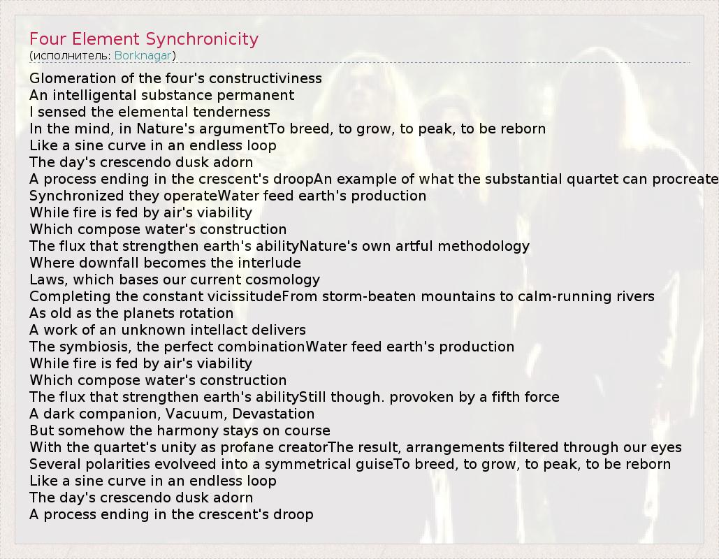 А как ты думаешь, о чем песня "Four Element Synchronicity" ?