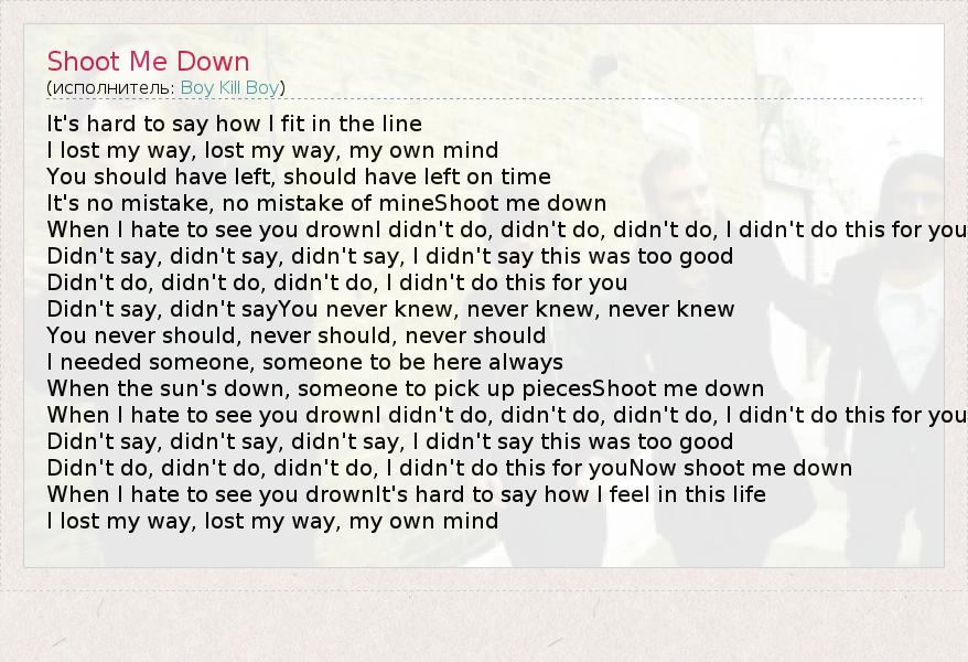 It's hard to say how I fit in the line I lost my way, lost my way, my own mind You should have left, should have left on time It's no mistake, no mistake of mineShoot me down When I hate to see you drownI didn't do, didn't do, didn't do, I didn't do this for you Didn't say, didn't say, didn't say, I didn't say this was too good Didn't do, didn't do, didn't do, I didn't do this for you Didn't say, didn't sayYou never knew, never knew, never knew You never should, never should, never should I needed someone, someone to be here always When the sun's down, someone to pick up piecesShoot me down When I hate to see you drownI didn't do, didn't do, didn't do, I didn't do this for you Didn't say, didn't say, didn't say, I didn't say this was too good Didn't do, didn't do, didn't do, I didn't do this for youNow shoot me down When I hate to see you drownIt's hard to say how I feel in this life I lost my way, lost my way, my own mind