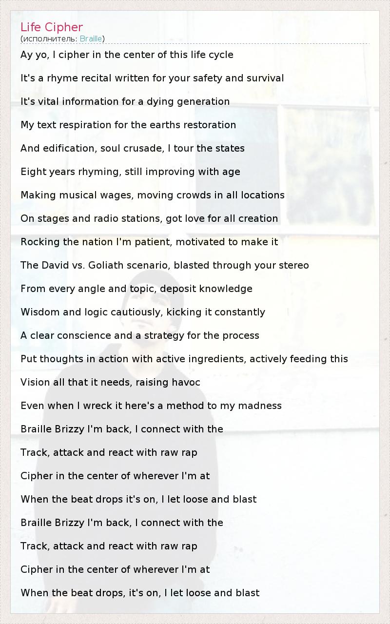 Ay yo, I cipher in the center of this life cycle It's a rhyme recital written for your safety and survival It's vital information for a dying generation My text respiration for the earths restoration And edification, soul crusade, I tour the states Eight years rhyming, still improving with age Making musical wages, moving crowds in all locations On stages and radio stations, got love for all creation Rocking the nation I'm patient, motivated to make it The David vs. Goliath scenario, blasted through your stereo From every angle and topic, deposit knowledge Wisdom and logic cautiously, kicking it constantly A clear conscience and a strategy for the process Put thoughts in action with active ingredients, actively feeding this Vision all that it needs, raising havoc Even when I wreck it here's a method to my madness Braille Brizzy I'm back, I connect with the Track, attack and react with raw rap Cipher in the center of wherever I'm at When the beat drops it's on, I let loose and blast Braille Brizzy I'm back, I connect with the Track, attack and react with raw rap Cipher in the center of wherever I'm at When the beat drops, it's on, I let loose and blast