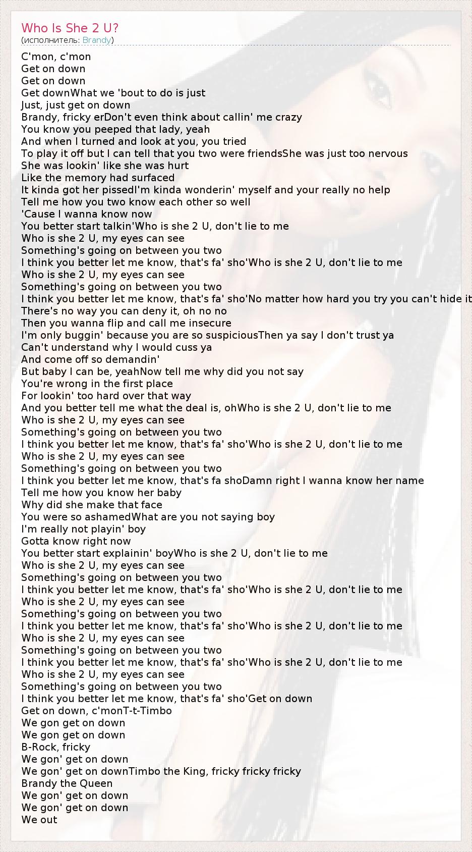 C'mon, c'mon Get on down Get on down Get downWhat we 'bout to do is just Just, just get on down Brandy, fricky erDon't even think about callin' me crazy You know you peeped that lady, yeah And when I turned and look at you, you tried To play it off but I can tell that you two were friendsShe was just too nervous She was lookin' like she was hurt Like the memory had surfaced It kinda got her pissedI'm kinda wonderin' myself and your really no help Tell me how you two know each other so well 'Cause I wanna know now You better start talkin'Who is she 2 U, don't lie to me Who is she 2 U, my eyes can see Something's going on between you two I think you better let me know, that's fa' sho'Who is she 2 U, don't lie to me Who is she 2 U, my eyes can see Something's going on between you two I think you better let me know, that's fa' sho'No matter how hard you try you can't hide it There's no way you can deny it, oh no no Then you wanna flip and call me insecure I'm only buggin' because you are so suspiciousThen ya say I don't trust ya Can't understand why I would cuss ya And come off so demandin' But baby I can be, yeahNow tell me why did you not say You're wrong in the first place For lookin' too hard over that way And you better tell me what the deal is, ohWho is she 2 U, don't lie to me Who is she 2 U, my eyes can see Something's going on between you two I think you better let me know, that's fa' sho'Who is she 2 U, don't lie to me Who is she 2 U, my eyes can see Something's going on between you two I think you better let me know, that's fa shoDamn right I wanna know her name Tell me how you know her baby Why did she make that face You were so ashamedWhat are you not saying boy I'm really not playin' boy Gotta know right now You better start explainin' boyWho is she 2 U, don't lie to me Who is she 2 U, my eyes can see Something's going on between you two I think you better let me know, that's fa' sho'Who is she 2 U, don't lie to me Who is she 2 U, my eyes can see Something's going on between you two I think you better let me know, that's fa' sho'Who is she 2 U, don't lie to me Who is she 2 U, my eyes can see Something's going on between you two I think you better let me know, that's fa' sho'Who is she 2 U, don't lie to me Who is she 2 U, my eyes can see Something's going on between you two I think you better let me know, that's fa' sho'Get on down Get on down, c'monT-t-Timbo We gon get on down We gon get on down B-Rock, fricky We gon' get on down We gon' get on downTimbo the King, fricky fricky fricky Brandy the Queen We gon' get on down We gon' get on down We out