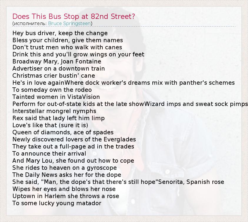 ГлавнаяИсполнителиBruce SpringsteenDoes This Bus Stop at 82nd Street?