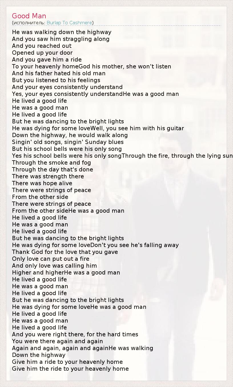 He was walking down the highway And you saw him straggling along And you reached out Opened up your door And you gave him a ride To your heavenly homeGod his mother, she won't listen And his father hated his old man But you listened to his feelings And your eyes consistently understand Yes, your eyes consistently understandHe was a good man He lived a good life He was a good man He lived a good life But he was dancing to the bright lights He was dying for some loveWell, you see him with his guitar Down the highway, he would walk along Singin' old songs, singin' Sunday blues But his school bells were his only song Yes his school bells were his only songThrough the fire, through the lying sun Through the smoke and fog Through the day that's done There was strength there There was hope alive There were strings of peace From the other side There were strings of peace From the other sideHe was a good man He lived a good life He was a good man He lived a good life But he was dancing to the bright lights He was dying for some loveDon't you see he's falling away Thank God for the love that you gave Only love can put out a fire And only love was calling him Higher and higherHe was a good man He lived a good life He was a good man He lived a good life But he was dancing to the bright lights He was dying for some loveHe was a good man He lived a good life He was a good man He lived a good life And you were right there, for the hard times You were there again and again Again and again, again and againHe was walking Down the highway Give him a ride to your heavenly home Give him the ride to your heavenly home