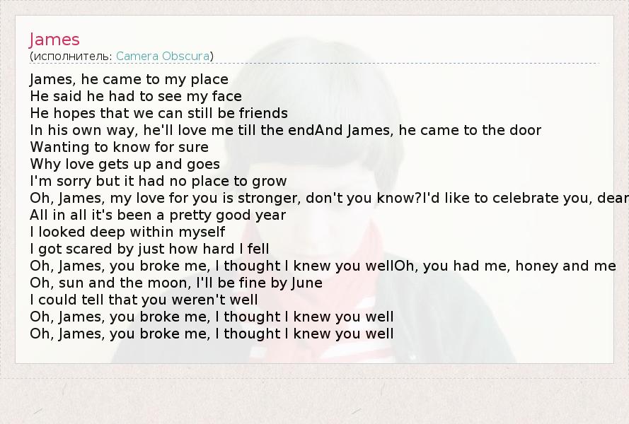 Oh, James, you broke me, I thought I knew you wellOh, you had me, honey and me