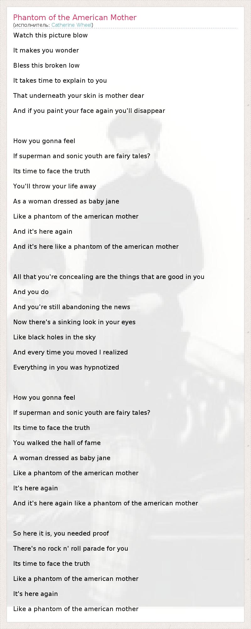 Watch this picture blow It makes you wonder Bless this broken low It takes time to explain to you That underneath your skin is mother dear And if you paint your face again you'll disappear How you gonna feel If superman and sonic youth are fairy tales? Its time to face the truth You'll throw your life away As a woman dressed as baby jane Like a phantom of the american mother And it's here again And it's here like a phantom of the american mother All that you're concealing are the things that are good in you And you do And you're still abandoning the news Now there's a sinking look in your eyes Like black holes in the sky And every time you moved I realized Everything in you was hypnotized How you gonna feel If superman and sonic youth are fairy tales? Its time to face the truth You walked the hall of fame A woman dressed as baby jane Like a phantom of the american mother It's here again And it's here again like a phantom of the american mother So here it is, you needed proof There's no rock n' roll parade for you Its time to face the truth Like a phantom of the american mother It's here again Like a phantom of the american mother
