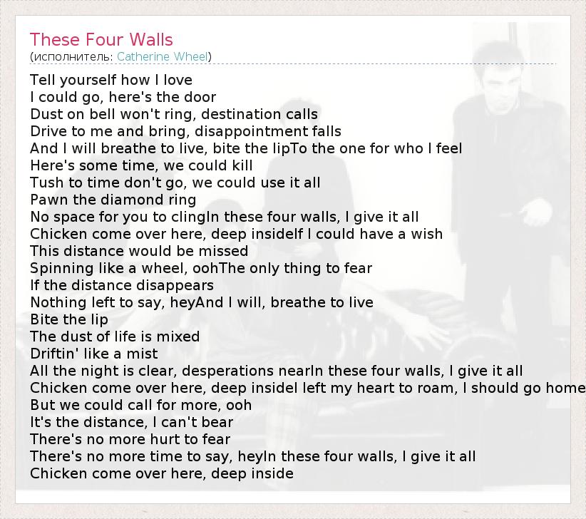 Tell yourself how I love I could go, here's the door Dust on bell won't ring, destination calls Drive to me and bring, disappointment falls And I will breathe to live, bite the lipTo the one for who I feel Here's some time, we could kill Tush to time don't go, we could use it all Pawn the diamond ring No space for you to clingIn these four walls, I give it all Chicken come over here, deep insideIf I could have a wish This distance would be missed Spinning like a wheel, oohThe only thing to fear If the distance disappears Nothing left to say, heyAnd I will, breathe to live Bite the lip The dust of life is mixed Driftin' like a mist All the night is clear, desperations nearIn these four walls, I give it all Chicken come over here, deep insideI left my heart to roam, I should go home But we could call for more, ooh It's the distance, I can't bear There's no more hurt to fear There's no more time to say, heyIn these four walls, I give it all Chicken come over here, deep inside