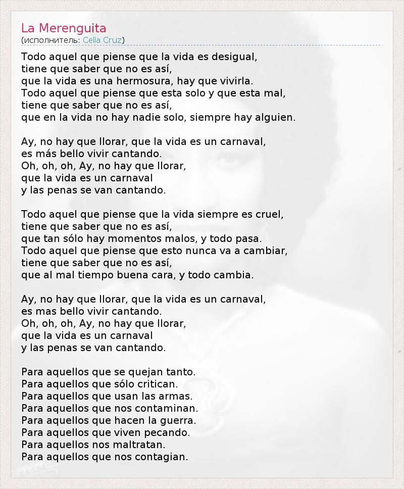 Жизнь — это карнавал Все те, кто думают, о том, что жизнь изменчива, Должны знать, что это не так, Что жизнь — это красота, что ее нужно прожить, Все те, кто думают о том, что они одиноки и им плохо, Должны знать, что это не так, Что в жизни никто не одинок, всегда есть кто-то. Ай, не нужно плакать, ведь жизнь — это карнавал, Гораздо лучше идти с песней по жизни. Ох, ох, ох, ай, не нужно плакать, Ведь жизнь — это карнавал, И с песней уходят все огорчения. Все те, кто думают, что жизнь всегда жестока, Должны знать, что это не так, Что плохие моменты случаются, но все проходит. Все те, кто думают, что это никогда не изменится, Должны знать, что это не так, Что нужно держать хорошую мину при плохой игре(1) и все пройдет. Ай, не нужно плакать, ведь жизнь – это карнавал, Гораздо лучше идти с песней по жизни. Ох, ох, ох, ай, не нужно плакать, Ведь жизнь – это карнавал, И с песней уходят все огорчения. Для тех, кто столько жалуется, Для тех, кто только критикует, Для тех, кто воюет, Для тех, кто нас портит, Для тех, кто начинает войну, Для тех, кто живет во грехе, Для тех, кто плохо с нами обращается, Для тех, кто нас развращает. 1) Испанская пословица «Al mal tiempo buena cara» дословно переводится «В плохое время – хорошее лицо!» и имеет русский эквивалент: «Держать хорошую мину при плохой игре». Перевод: Екатерина (Elis) © lyrsense.com