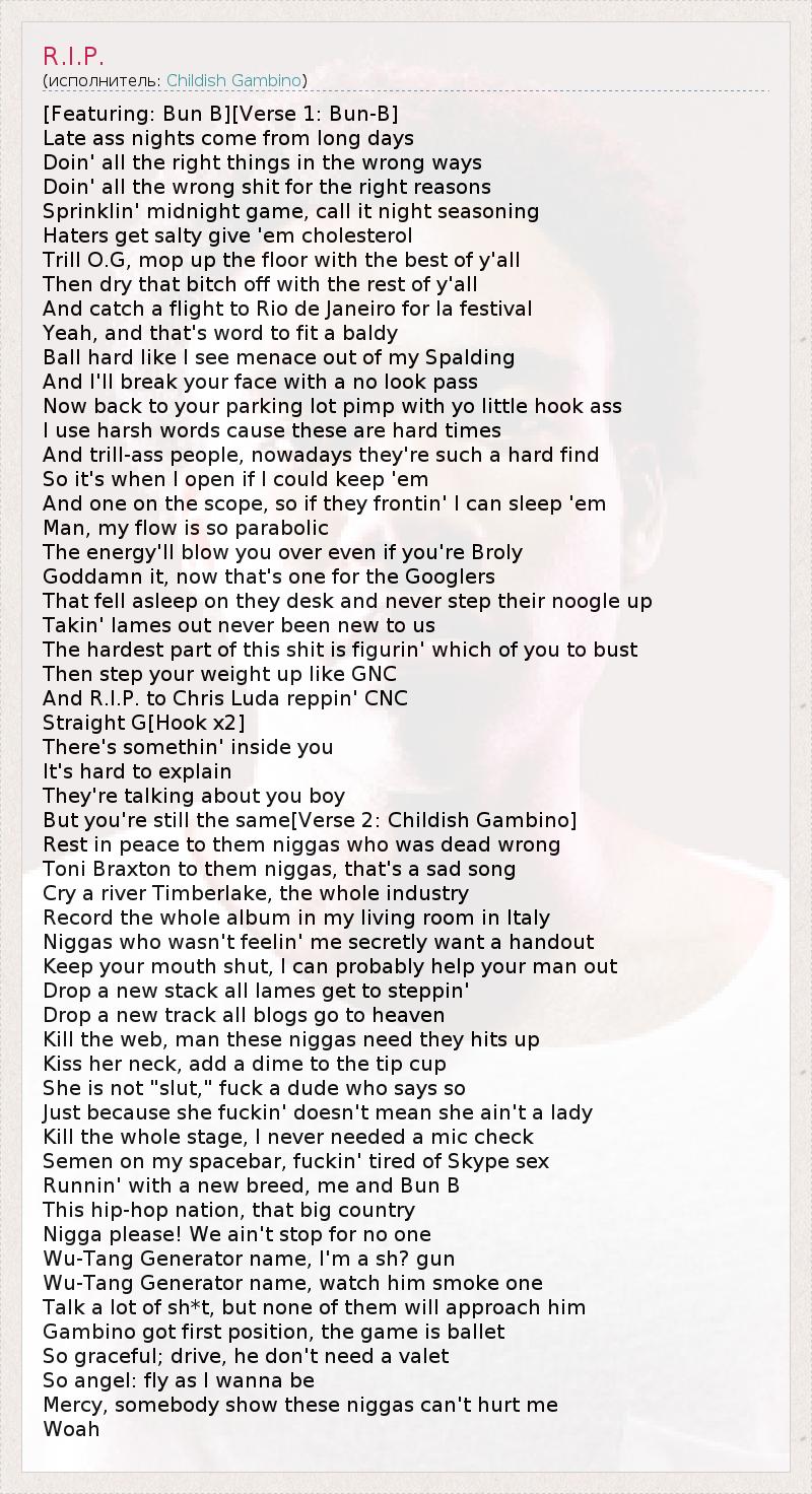 [Featuring: Bun B][Verse 1: Bun-B] Late ass nights come from long days Doin' all the right things in the wrong ways Doin' all the wrong shit for the right reasons Sprinklin' midnight game, call it night seasoning Haters get salty give 'em cholesterol Trill O.G, mop up the floor with the best of y'all Then dry that bitch off with the rest of y'all And catch a flight to Rio de Janeiro for la festival Yeah, and that's word to fit a baldy Ball hard like I see menace out of my Spalding And I'll break your face with a no look pass Now back to your parking lot pimp with yo little hook ass I use harsh words cause these are hard times And trill-ass people, nowadays they're such a hard find So it's when I open if I could keep 'em And one on the scope, so if they frontin' I can sleep 'em Man, my flow is so parabolic The energy'll blow you over even if you're Broly Goddamn it, now that's one for the Googlers That fell asleep on they desk and never step their noogle up Takin' lames out never been new to us The hardest part of this shit is figurin' which of you to bust Then step your weight up like GNC And R.I.P. to Chris Luda reppin' CNC Straight G[Hook x2] There's somethin' inside you It's hard to explain They're talking about you boy But you're still the same[Verse 2: Childish Gambino] Rest in peace to them niggas who was dead wrong Toni Braxton to them niggas, that's a sad song Cry a river Timberlake, the whole industry Record the whole album in my living room in Italy Niggas who wasn't feelin' me secretly want a handout Keep your mouth shut, I can probably help your man out Drop a new stack all lames get to steppin' Drop a new track all blogs go to heaven Kill the web, man these niggas need they hits up Kiss her neck, add a dime to the tip cup She is not "slut," fuck a dude who says so Just because she fuckin' doesn't mean she ain't a lady Kill the whole stage, I never needed a mic check Semen on my spacebar, fuckin' tired of Skype sex Runnin' with a new breed, me and Bun B This hip-hop nation, that big country Nigga please! We ain't stop for no one Wu-Tang Generator name, I'm a sh? gun Wu-Tang Generator name, watch him smoke one Talk a lot of sh*t, but none of them will approach him Gambino got first position, the game is ballet So graceful; drive, he don't need a valet So angel: fly as I wanna be Mercy, somebody show these niggas can't hurt me Woah