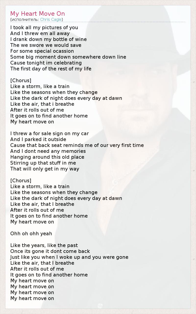 I took all my pictures of you And I threw em all away I drank down my bottle of wine The we swore we would save For some special ocassion Some big moment down somewhere down line Cause tonight im celebrating The first day of the rest of my life [Chorus] Like a storm, like a train Like the seasons when they change Like the dark of night does every day at dawn Like the air, that i breathe After it rolls out of me It goes on to find another home My heart move on I threw a for sale sign on my car And I parked it outside Cause that back seat reminds me of our very first time And I dont need any memories Hanging around this old place Stirring up that stuff in me That will only get in my way [Chorus] Like a storm, like a train Like the seasons when they change Like the dark of night does every day at dawn Like the air, that I breathe After it rolls out of me It goes on to find another home My heart move on Ohh oh ohh yeah Like the years, like the past Once its gone it dont come back Just like you when I woke up and you were gone Like the air, that I breathe After it rolls out of me It goes on to find another home My heart move on My heart move on My heart move on My heart move on