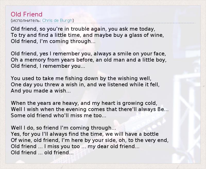 Old friend, so you're in trouble again, you ask me today, To try and find a little time, and maybe buy a glass of wine, Old friend, I'm coming through... Old friend, yes I remember you, always a smile on your face, Oh a memory from years before, an old man and a little boy, Old friend, I remember you... You used to take me fishing down by the wishing well, One day you threw a wish in, and we listened while it fell, And you made a wish... When the years are heavy, and my heart is growing cold, Well I wish when the evening comes that there'll always Be... Some old friend who'll miss me too... Well I do, so friend I'm coming through... Yes, for you I'll always find the time, we will have a bottle Of wine, old friend, I'm here by your side, oh, to the very end, Old friend ... I miss you too ... my dear old friend... Old friend ... old friend...
