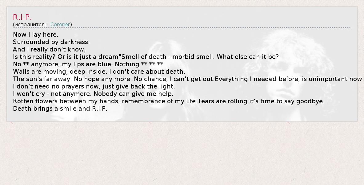 Now I lay here. Surrounded by darkness. And I really don't know, Is this reality? Or is it just a dream"Smell of death - morbid smell. What else can it be? No ** anymore, my lips are blue. Nothing ** ** ** Walls are moving, deep inside. I don't care about death. The sun's far away. No hope any more. No chance, I can't get out.Everything I needed before, is unimportant now. I don't need no prayers now, just give back the light. I won't cry - not anymore. Nobody can give me help. Rotten flowers between my hands, remembrance of my life.Tears are rolling it's time to say goodbye. Death brings a smile and R.I.P.