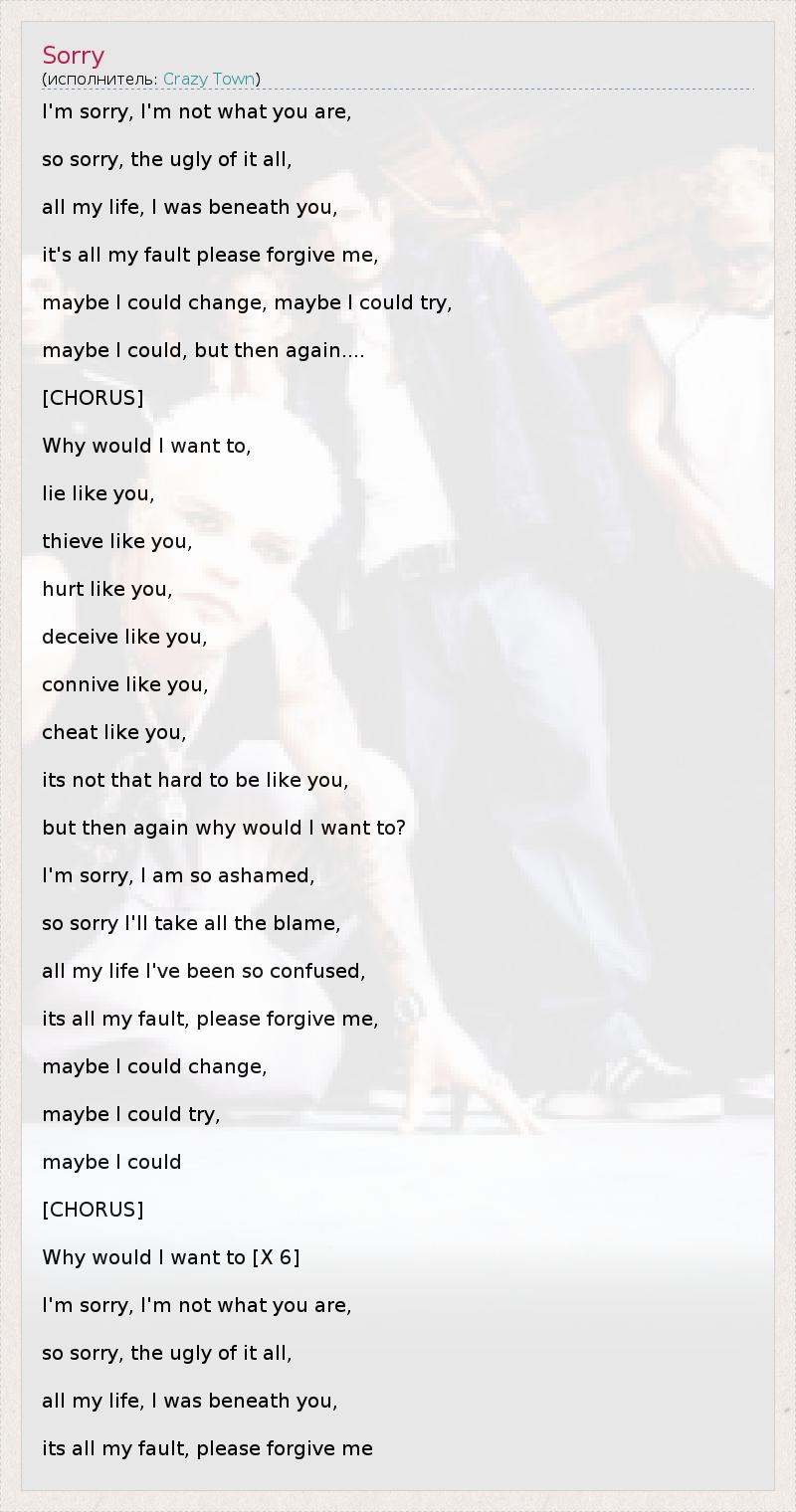 Это интересно:Crazy Town - группа из семи человек, зародившаяся в Городе Ангелов, перенаправляет курс современной музыки своим дебютным альбомом The Gift Of The Game, записанным на Columbia Records. Возглавлена группа поэтами, вокалистами, фронтмэнами и продюсерами Shifty Shellshock ( Увёртливая Гильза) и Epic Mazur(Лабиринт), которые в последние 8 лет были участниками рэп-движения вне сцены. Crazy Town мастерски микширует лирические струны... продолжение