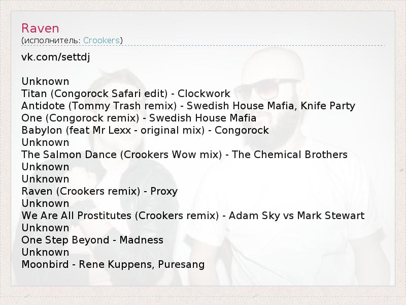 Это интересно:Crookers – продюсер из Италии, известный как Phra (и ранее Bot), выпускающий назойливый электро-хаус. Их первый международный релиз был выпущен Recordings в Берлине (Funk Mundial), для которого Crookers постовляли различные ремиксы. Позже они выпустили два микса в 2008 году ("Knobbers" и "Mad Kidz", как группа, обладающая исключительно оригинальными композициями).Затем появился Diplo, который махом подписал... продолжение
