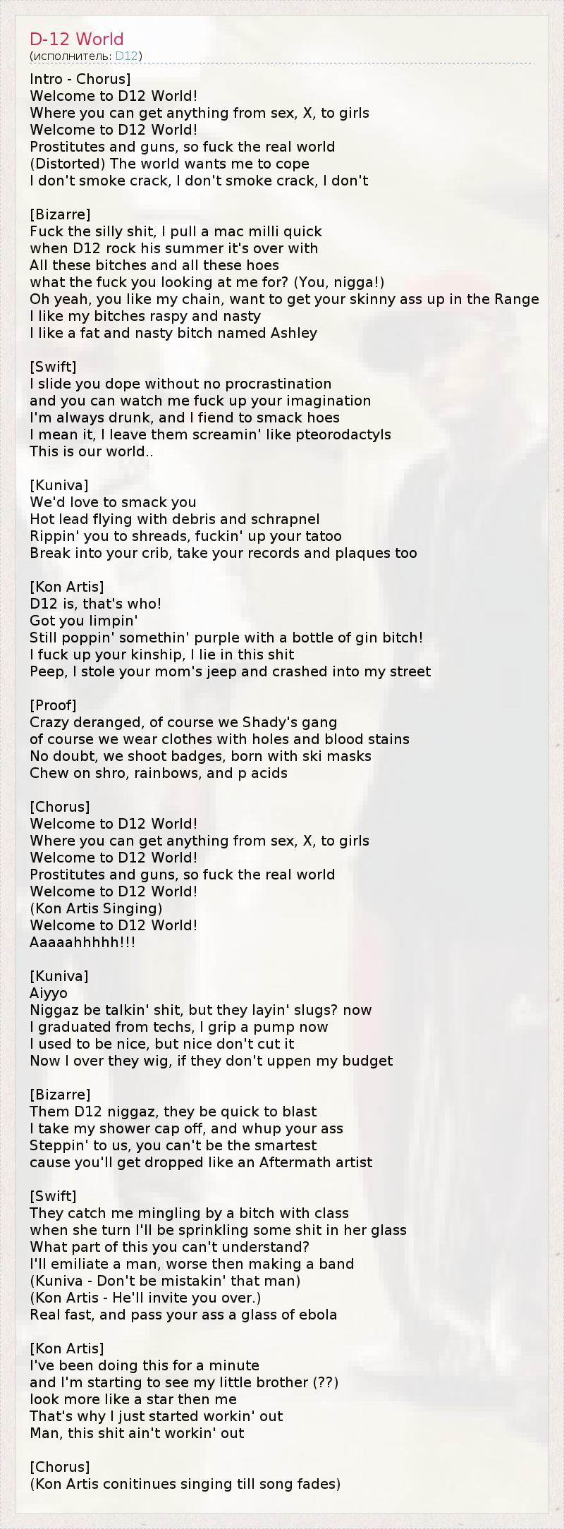 Это интересно:D12 (Dirty Dozen) - рэп-группа, образованная в 90х годах. Основателем D12 считается Proof (ныне покойный, но об этом позже). Именно ему приписывают идею создания коалиции детройтских MC. После недолгих раздумий о численном составе остановились на цифре 12. Название подобрали в соответствии с концепцией: D12, что означает Dirty Dozen - "грязная дюжина". Однако во всем Детройте удалось наскрести только шесть... продолжение