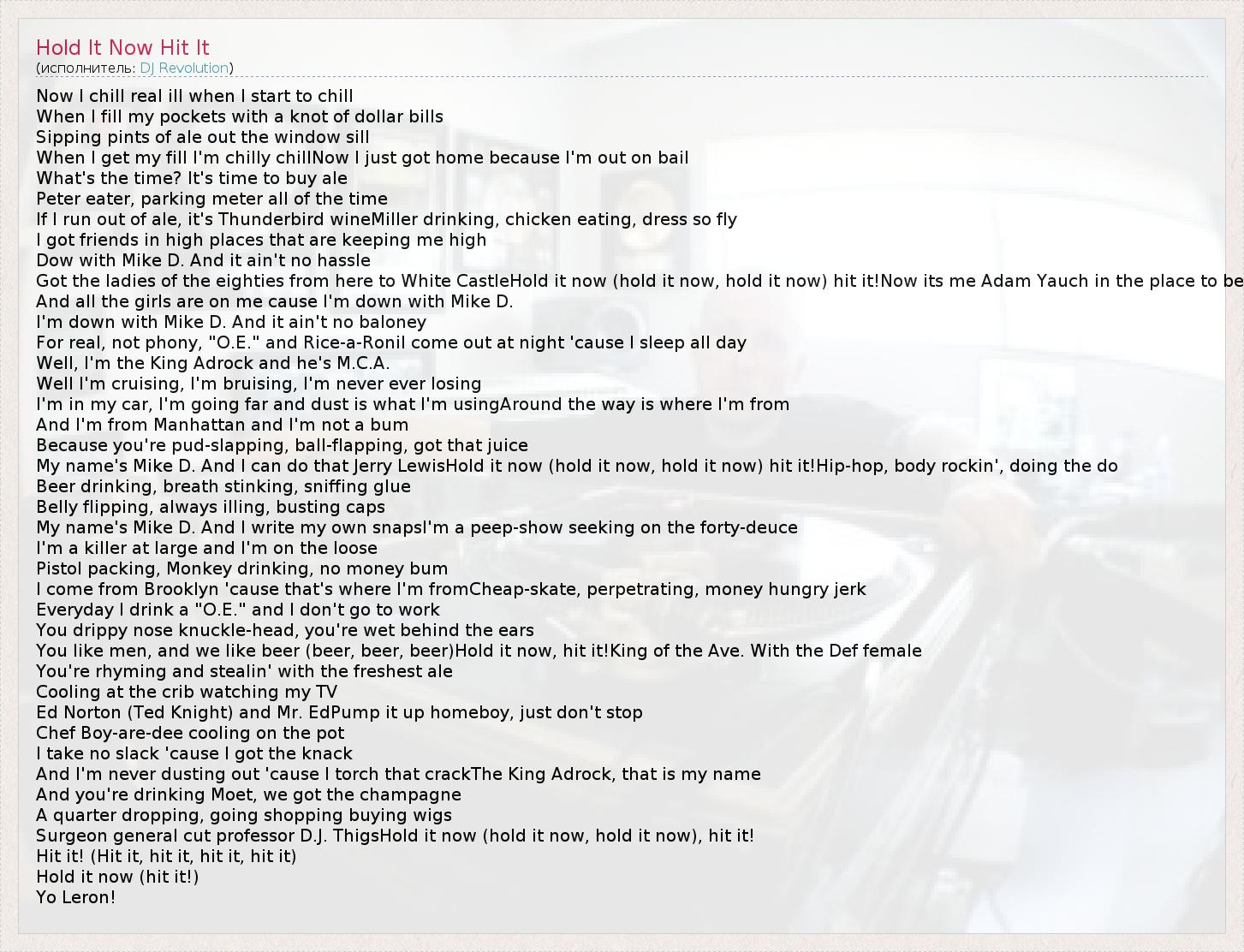 Now I chill real ill when I start to chill When I fill my pockets with a knot of dollar bills Sipping pints of ale out the window sill When I get my fill I'm chilly chillNow I just got home because I'm out on bail What's the time? It's time to buy ale Peter eater, parking meter all of the time If I run out of ale, it's Thunderbird wineMiller drinking, chicken eating, dress so fly I got friends in high places that are keeping me high Dow with Mike D. And it ain't no hassle Got the ladies of the eighties from here to White CastleHold it now (hold it now, hold it now) hit it!Now its me Adam Yauch in the place to be And all the girls are on me cause I'm down with Mike D. I'm down with Mike D. And it ain't no baloney For real, not phony, "O.E." and Rice-a-RoniI come out at night 'cause I sleep all day Well, I'm the King Adrock and he's M.C.A. Well I'm cruising, I'm bruising, I'm never ever losing I'm in my car, I'm going far and dust is what I'm usingAround the way is where I'm from And I'm from Manhattan and I'm not a bum Because you're pud-slapping, ball-flapping, got that juice My name's Mike D. And I can do that Jerry LewisHold it now (hold it now, hold it now) hit it!Hip-hop, body rockin', doing the do Beer drinking, breath stinking, sniffing glue Belly flipping, always illing, busting caps My name's Mike D. And I write my own snapsI'm a peep-show seeking on the forty-deuce I'm a killer at large and I'm on the loose Pistol packing, Monkey drinking, no money bum I come from Brooklyn 'cause that's where I'm fromCheap-skate, perpetrating, money hungry jerk Everyday I drink a "O.E." and I don't go to work You drippy nose knuckle-head, you're wet behind the ears You like men, and we like beer (beer, beer, beer)Hold it now, hit it!King of the Ave. With the Def female You're rhyming and stealin' with the freshest ale Cooling at the crib watching my TV Ed Norton (Ted Knight) and Mr. EdPump it up homeboy, just don't stop Chef Boy-are-dee cooling on the pot I take no slack 'cause I got the knack And I'm never dusting out 'cause I torch that crackThe King Adrock, that is my name And you're drinking Moet, we got the champagne A quarter dropping, going shopping buying wigs Surgeon general cut professor D.J. ThigsHold it now (hold it now, hold it now), hit it! Hit it! (Hit it, hit it, hit it, hit it) Hold it now (hit it!) Yo Leron!