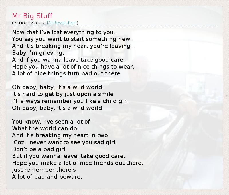Now that I've lost everything to you, You say you want to start something new. And it's breaking my heart you're leaving - Baby I'm grieving. And if you wanna leave take good care. Hope you have a lot of nice things to wear, A lot of nice things turn bad out there. Oh baby, baby, it's a wild world. It's hard to get by just upon a smile I'll always remember you like a child girl Oh baby, baby, it's a wild world You know, I've seen a lot of What the world can do. And it's breaking my heart in two 'Coz I never want to see you sad girl. Don't be a bad girl. But if you wanna leave, take good care. Hope you make a lot of nice friends out there. Just remember there's A lot of bad and beware.