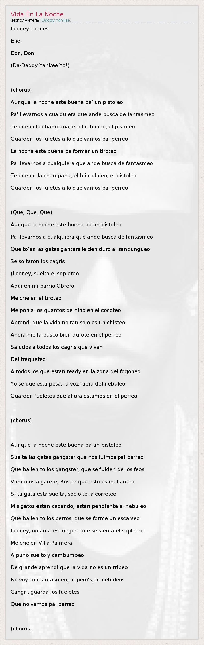 Looney Toones Eliel Don, Don (Da-Daddy Yankee Yo!) (chorus) Aunque la noche este buena pa' un pistoleo Pa' llevarnos a cualquiera que ande busca de fantasmeo Te buena la champana, el blin-blineo, el pistoleo Guarden los fuletes a lo que vamos pal perreo La noche este buena pa formar un tiroteo Pa llevarnos a cualquiera que ande busca de fantasmeo Te buena la champana, el blin-blineo, el pistoleo Guarden los fuletes a lo que vamos pal perreo (Que, Que, Que) Aunque la noche este buena pa un pistoleo Pa llevarnos a cualquiera que ande busca de fantasmeo Que to'as las gatas ganters le den duro al sandungueo Se soltaron los cagris (Looney, suelta el sopleteo Aqui en mi barrio Obrero Me crie en el tiroteo Me ponia los guantos de nino en el cocoteo Aprendi que la vida no tan solo es un chisteo Ahora me la busco bien durote en el perreo Saludos a todos los cagris que viven Del traqueteo A todos los que estan ready en la zona del fogoneo Yo se que esta pesa, la voz fuera del nebuleo Guarden fueletes que ahora estamos en el perreo (chorus) Aunque la noche este buena pa un pistoleo Suelta las gatas gangster que nos fuimos pal perreo Que bailen to'los gangster, que se fuiden de los feos Vamonos algarete, Boster que esto es malianteo Si tu gata esta suelta, socio te la correteo Mis gatos estan cazando, estan pendiente al nebuleo Que bailen to'los perros, que se forme un escarseo Looney, no amares fuegos, que se sienta el sopleteo Me crie en Villa Palmera A puno suelto y cambumbeo De grande aprendi que la vida no es un tripeo No voy con fantasmeo, ni pero's, ni nebuleos Cangri, guarda los fueletes Que no vamos pal perreo (chorus)