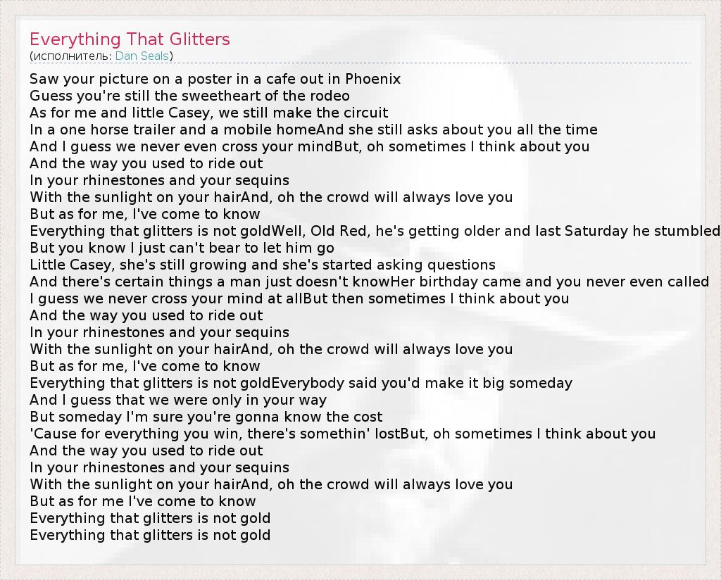 Saw your picture on a poster in a cafe out in Phoenix Guess you're still the sweetheart of the rodeo As for me and little Casey, we still make the circuit In a one horse trailer and a mobile homeAnd she still asks about you all the time And I guess we never even cross your mindBut, oh sometimes I think about you And the way you used to ride out In your rhinestones and your sequins With the sunlight on your hairAnd, oh the crowd will always love you But as for me, I've come to know Everything that glitters is not goldWell, Old Red, he's getting older and last Saturday he stumbled But you know I just can't bear to let him go Little Casey, she's still growing and she's started asking questions And there's certain things a man just doesn't knowHer birthday came and you never even called I guess we never cross your mind at allBut then sometimes I think about you And the way you used to ride out In your rhinestones and your sequins With the sunlight on your hairAnd, oh the crowd will always love you But as for me, I've come to know Everything that glitters is not goldEverybody said you'd make it big someday And I guess that we were only in your way But someday I'm sure you're gonna know the cost 'Cause for everything you win, there's somethin' lostBut, oh sometimes I think about you And the way you used to ride out In your rhinestones and your sequins With the sunlight on your hairAnd, oh the crowd will always love you But as for me I've come to know Everything that glitters is not gold Everything that glitters is not gold