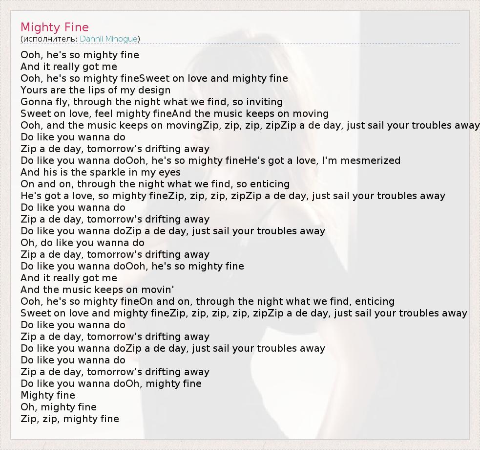 Ooh, he's so mighty fine And it really got me Ooh, he's so mighty fineSweet on love and mighty fine Yours are the lips of my design Gonna fly, through the night what we find, so inviting Sweet on love, feel mighty fineAnd the music keeps on moving Ooh, and the music keeps on movingZip, zip, zip, zipZip a de day, just sail your troubles away Do like you wanna do Zip a de day, tomorrow's drifting away Do like you wanna doOoh, he's so mighty fineHe's got a love, I'm mesmerized And his is the sparkle in my eyes On and on, through the night what we find, so enticing He's got a love, so mighty fineZip, zip, zip, zipZip a de day, just sail your troubles away Do like you wanna do Zip a de day, tomorrow's drifting away Do like you wanna doZip a de day, just sail your troubles away Oh, do like you wanna do Zip a de day, tomorrow's drifting away Do like you wanna doOoh, he's so mighty fine And it really got me And the music keeps on movin' Ooh, he's so mighty fineOn and on, through the night what we find, enticing Sweet on love and mighty fineZip, zip, zip, zip, zipZip a de day, just sail your troubles away Do like you wanna do Zip a de day, tomorrow's drifting away Do like you wanna doZip a de day, just sail your troubles away Do like you wanna do Zip a de day, tomorrow's drifting away Do like you wanna doOh, mighty fine Mighty fine Oh, mighty fine Zip, zip, mighty fine