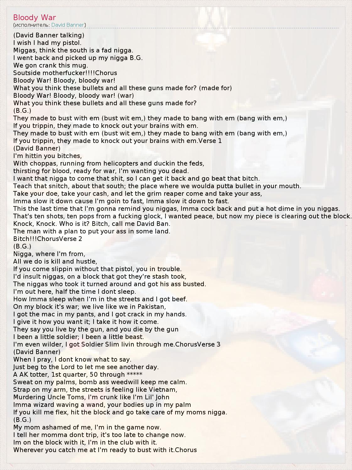 Это интересно:David Banner a.k.a. Mr.Mississippi,настоящее имя которого Levell Crump,родился в городе Джексоне (Jackson),штат Миссиссиппи (Mississippi).Ранняя карьераПеред своей сольной карьерой,Banner входил в состав рэп группы Crooked Lettaz,которые состояли из 2-х человек.У них есть альбом - "Grey Skies" (1999).Спустя год после этого,он выпускает свой первый (не официальный) сольник - "Them Firewater Boyz,vol.1" (2000).Альбом разошёлся в количестве... продолжение