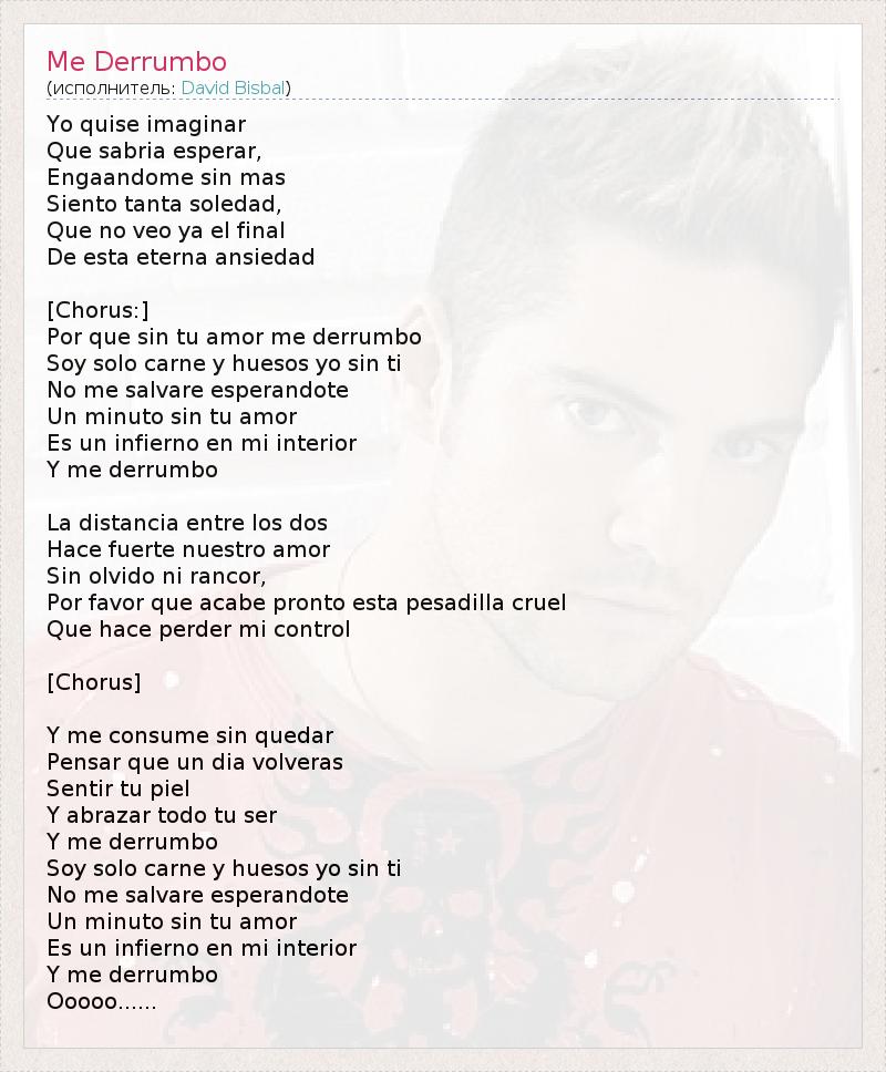 Это интересно:Давид Бисбал дебютировал в испанской "Фабрике звезд" - Operacion Triunfo. Его первый альбом Corazon Latino завоевал слушателей во всем испаноговорящем мире, а хиты с него не раз становились платиновыми. Стиль Давида - зажигательный и романтические песни латино.