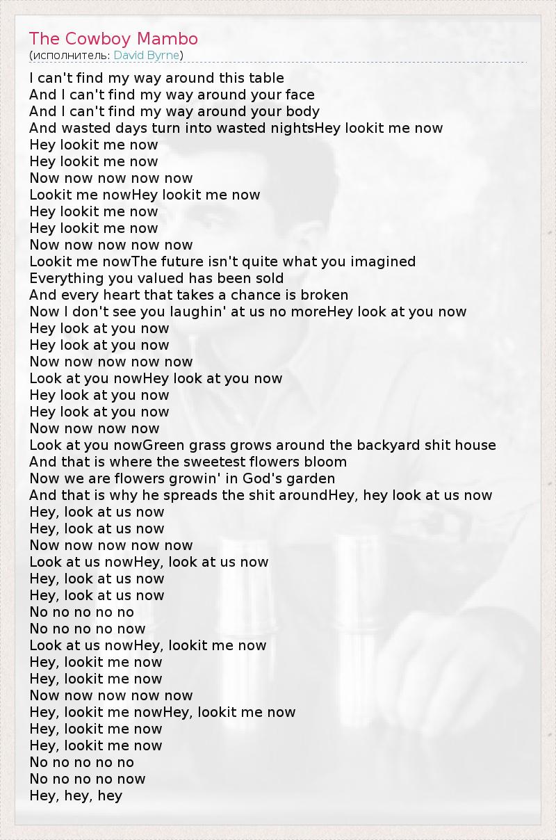 I can't find my way around this table And I can't find my way around your face And I can't find my way around your body And wasted days turn into wasted nightsHey lookit me now Hey lookit me now Hey lookit me now Now now now now now Lookit me nowHey lookit me now Hey lookit me now Hey lookit me now Now now now now now Lookit me nowThe future isn't quite what you imagined Everything you valued has been sold And every heart that takes a chance is broken Now I don't see you laughin' at us no moreHey look at you now Hey look at you now Hey look at you now Now now now now now Look at you nowHey look at you now Hey look at you now Hey look at you now Now now now now Look at you nowGreen grass grows around the backyard shit house And that is where the sweetest flowers bloom Now we are flowers growin' in God's garden And that is why he spreads the shit aroundHey, hey look at us now Hey, look at us now Hey, look at us now Now now now now now Look at us nowHey, look at us now Hey, look at us now Hey, look at us now No no no no no No no no no now Look at us nowHey, lookit me now Hey, lookit me now Hey, lookit me now Now now now now now Hey, lookit me nowHey, lookit me now Hey, lookit me now Hey, lookit me now No no no no no No no no no now Hey, hey, hey
