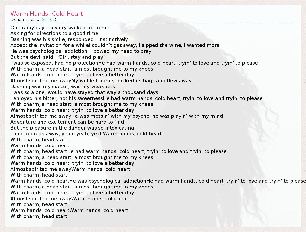 А как ты думаешь, о чем песня "Warm Hands, Cold Heart" ?