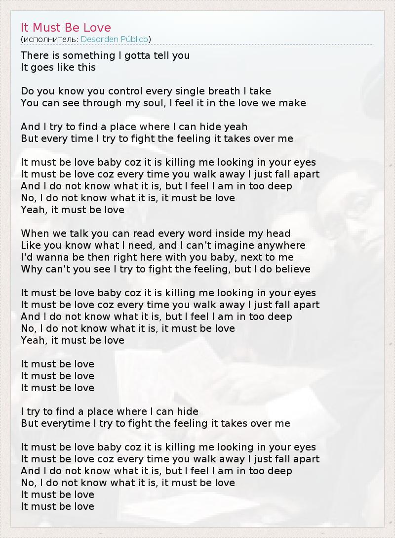 There is something I gotta tell you It goes like this Do you know you control every single breath I take You can see through my soul, I feel it in the love we make And I try to find a place where I can hide yeah But every time I try to fight the feeling it takes over me It must be love baby coz it is killing me looking in your eyes It must be love coz every time you walk away I just fall apart And I do not know what it is, but I feel I am in too deep No, I do not know what it is, it must be love Yeah, it must be love When we talk you can read every word inside my head Like you know what I need, and I can’t imagine anywhere I'd wanna be then right here with you baby, next to me Why can't you see I try to fight the feeling, but I do believe It must be love baby coz it is killing me looking in your eyes It must be love coz every time you walk away I just fall apart And I do not know what it is, but I feel I am in too deep No, I do not know what it is, it must be love Yeah, it must be love It must be love It must be love It must be love I try to find a place where I can hide But everytime I try to fight the feeling it takes over me It must be love baby coz it is killing me looking in your eyes It must be love coz every time you walk away I just fall apart And I do not know what it is, but I feel I am in too deep No, I do not know what it is, it must be love It must be love It must be love