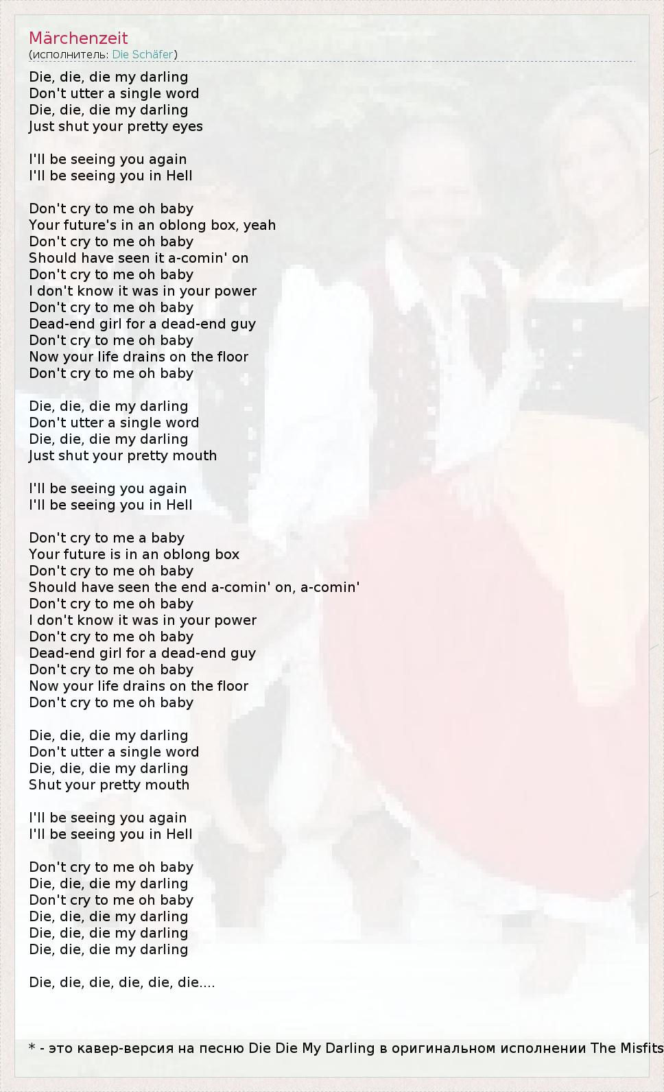 Die, die, die my darling Don't utter a single word Die, die, die my darling Just shut your pretty eyes I'll be seeing you again I'll be seeing you in Hell Don't cry to me oh baby Your future's in an oblong box, yeah Don't cry to me oh baby Should have seen it a-comin' on Don't cry to me oh baby I don't know it was in your power Don't cry to me oh baby Dead-end girl for a dead-end guy Don't cry to me oh baby Now your life drains on the floor Don't cry to me oh baby Die, die, die my darling Don't utter a single word Die, die, die my darling Just shut your pretty mouth I'll be seeing you again I'll be seeing you in Hell Don't cry to me a baby Your future is in an oblong box Don't cry to me oh baby Should have seen the end a-comin' on, a-comin' Don't cry to me oh baby I don't know it was in your power Don't cry to me oh baby Dead-end girl for a dead-end guy Don't cry to me oh baby Now your life drains on the floor Don't cry to me oh baby Die, die, die my darling Don't utter a single word Die, die, die my darling Shut your pretty mouth I'll be seeing you again I'll be seeing you in Hell Don't cry to me oh baby Die, die, die my darling Don't cry to me oh baby Die, die, die my darling Die, die, die my darling Die, die, die my darling Die, die, die, die, die, die.... * - это кавер-версия на песню Die Die My Darling в оригинальном исполнении The Misfits