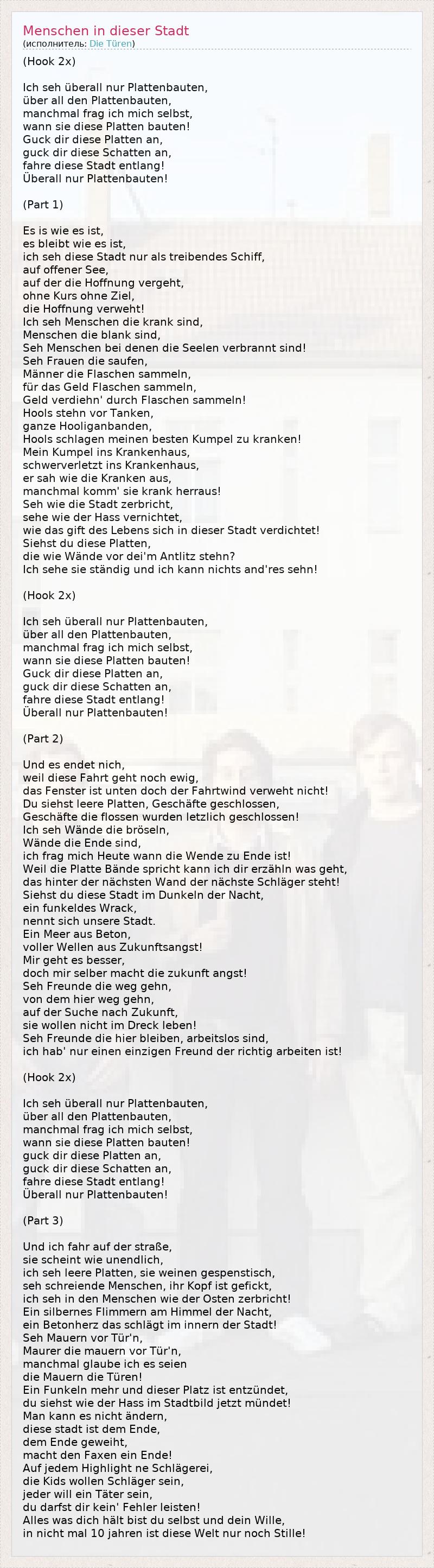 ГлавнаяИсполнителиDie TürenMenschen in dieser Stadt