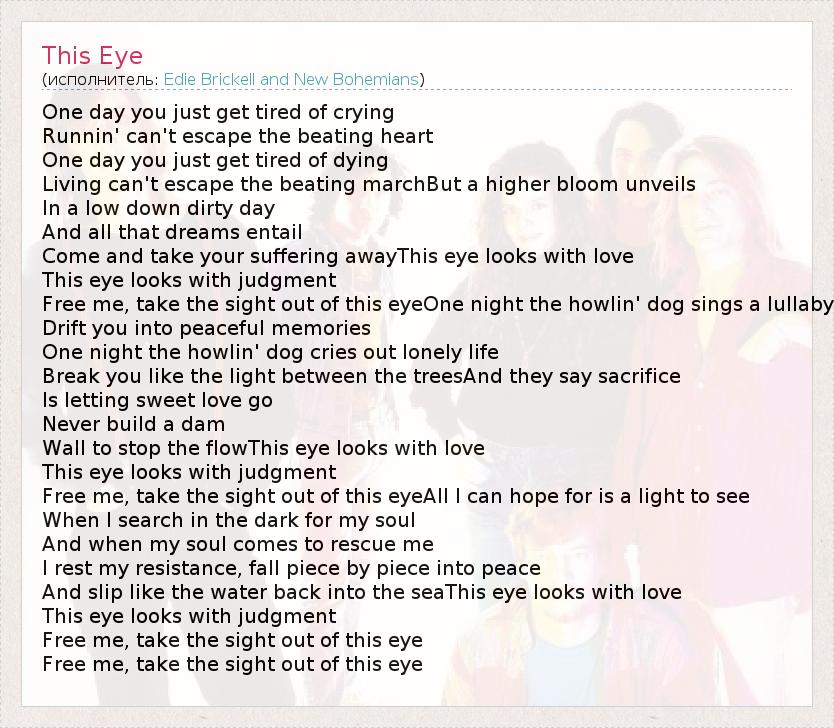 One day you just get tired of crying Runnin' can't escape the beating heart One day you just get tired of dying Living can't escape the beating marchBut a higher bloom unveils In a low down dirty day And all that dreams entail Come and take your suffering awayThis eye looks with love This eye looks with judgment Free me, take the sight out of this eyeOne night the howlin' dog sings a lullaby Drift you into peaceful memories One night the howlin' dog cries out lonely life Break you like the light between the treesAnd they say sacrifice Is letting sweet love go Never build a dam Wall to stop the flowThis eye looks with love This eye looks with judgment Free me, take the sight out of this eyeAll I can hope for is a light to see When I search in the dark for my soul And when my soul comes to rescue me I rest my resistance, fall piece by piece into peace And slip like the water back into the seaThis eye looks with love This eye looks with judgment Free me, take the sight out of this eye Free me, take the sight out of this eye