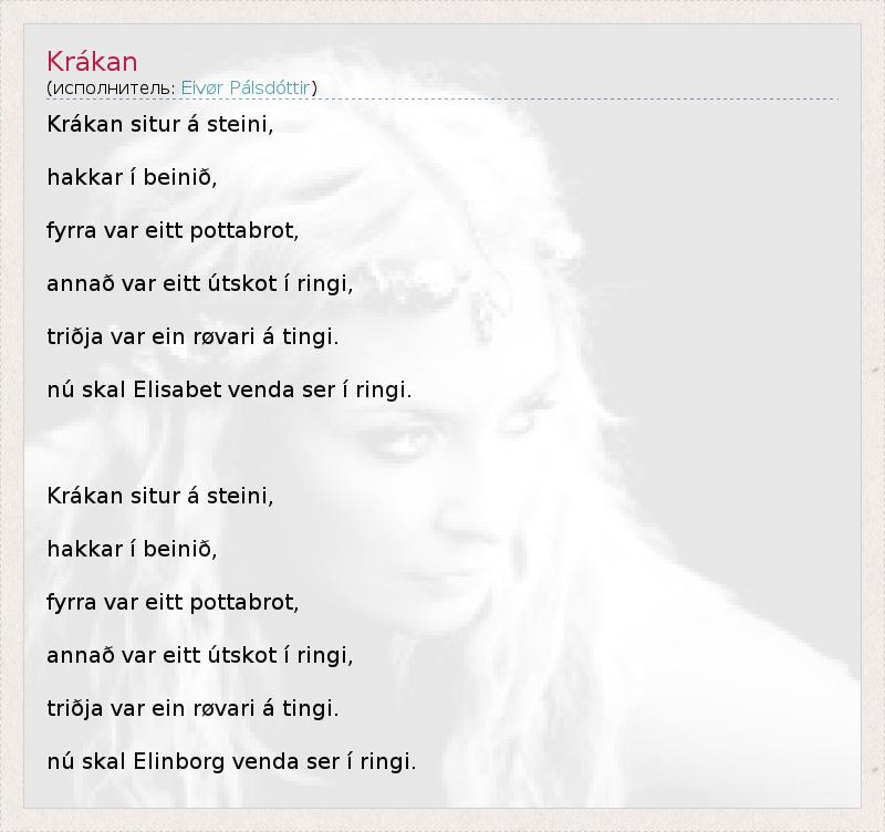 Это интересно:Эйвор Паульсдоуттир— фарерская певица и автор песен. В её творчестве смешиваются элементы джаза, фолка, кантри, рока а также классической и христианской музыки. За её манеру исполнения певицу часто называют фарерской Бьорк.В двенадцатилетнем возрасте Айвёр выступала в составе фарерского хора в Италии. В 13 лет она впервые появилась на фарерском телевидении и в том же году стала победительницей... продолжение