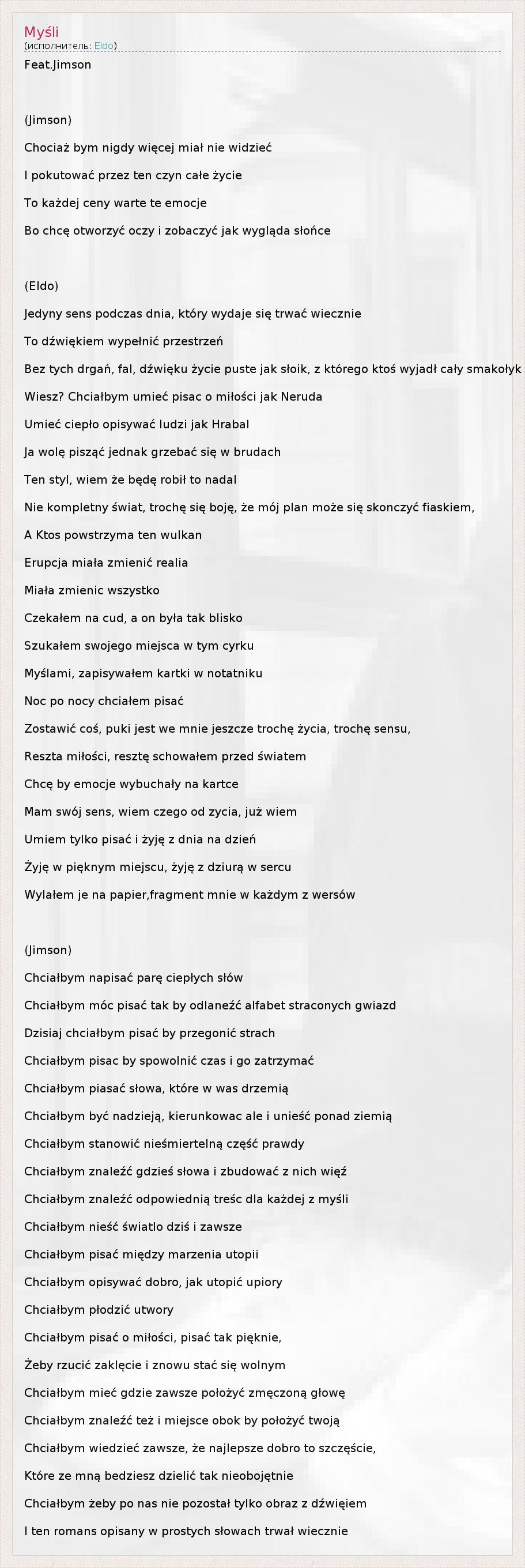 Feat.Jimson (Jimson) Chociaż bym nigdy więcej miał nie widzieć I pokutować przez ten czyn całe życie To każdej ceny warte te emocje Bo chcę otworzyć oczy i zobaczyć jak wygląda słońce (Eldo) Jedyny sens podczas dnia, który wydaje się trwać wiecznie To dźwiękiem wypełnić przestrzeń Bez tych drgań, fal, dźwięku życie puste jak słoik, z którego ktoś wyjadł cały smakołyk Wiesz? Chciałbym umieć pisac o miłości jak Neruda Umieć ciepło opisywać ludzi jak Hrabal Ja wolę pisząć jednak grzebać się w brudach Ten styl, wiem że będę robił to nadal Nie kompletny świat, trochę się boję, że mój plan może się skonczyć fiaskiem, A Ktos powstrzyma ten wulkan Erupcja miała zmienić realia Miała zmienic wszystko Czekałem na cud, a on była tak blisko Szukałem swojego miejsca w tym cyrku Myślami, zapisywałem kartki w notatniku Noc po nocy chciałem pisać Zostawić coś, puki jest we mnie jeszcze trochę życia, trochę sensu, Reszta miłości, resztę schowałem przed światem Chcę by emocje wybuchały na kartce Mam swój sens, wiem czego od zycia, już wiem Umiem tylko pisać i żyję z dnia na dzień Żyję w pięknym miejscu, żyję z dziurą w sercu Wylałem je na papier,fragment mnie w każdym z wersów (Jimson) Chciałbym napisać parę ciepłych słów Chciałbym móc pisać tak by odlaneźć alfabet straconych gwiazd Dzisiaj chciałbym pisać by przegonić strach Chciałbym pisac by spowolnić czas i go zatrzymać Chciałbym piasać słowa, które w was drzemią Chciałbym być nadzieją, kierunkowac ale i unieść ponad ziemią Chciałbym stanowić nieśmiertelną część prawdy Chciałbym znaleźć gdzieś słowa i zbudować z nich więź Chciałbym znaleźć odpowiednią treśc dla każdej z myśli Chciałbym nieść światlo dziś i zawsze Chciałbym pisać między marzenia utopii Chciałbym opisywać dobro, jak utopić upiory Chciałbym płodzić utwory Chciałbym pisać o miłości, pisać tak pięknie, Żeby rzucić zaklęcie i znowu stać się wolnym Chciałbym mieć gdzie zawsze położyć zmęczoną głowę Chciałbym znaleźć też i miejsce obok by położyć twoją Chciałbym wiedzieć zawsze, że najlepsze dobro to szczęście, Które ze mną bedziesz dzielić tak nieobojętnie Chciałbym żeby po nas nie pozostał tylko obraz z dźwięiem I ten romans opisany w prostych słowach trwał wiecznie