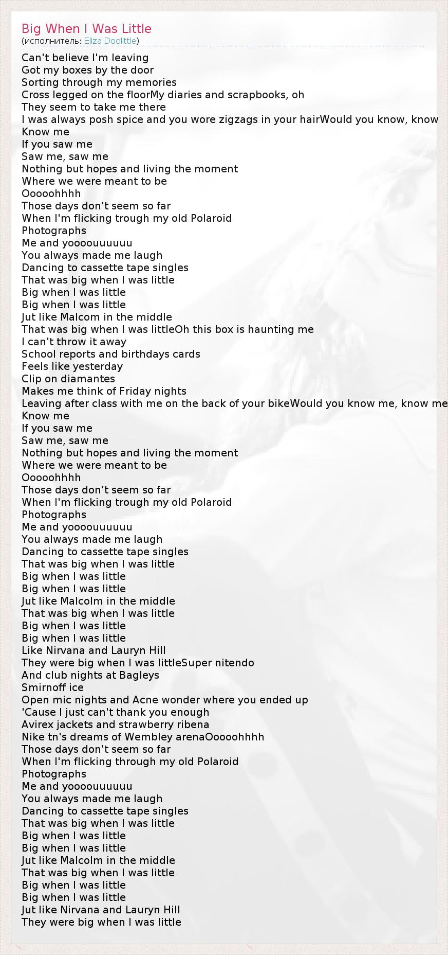 А как ты думаешь, о чем песня "Big When I Was Little" ?