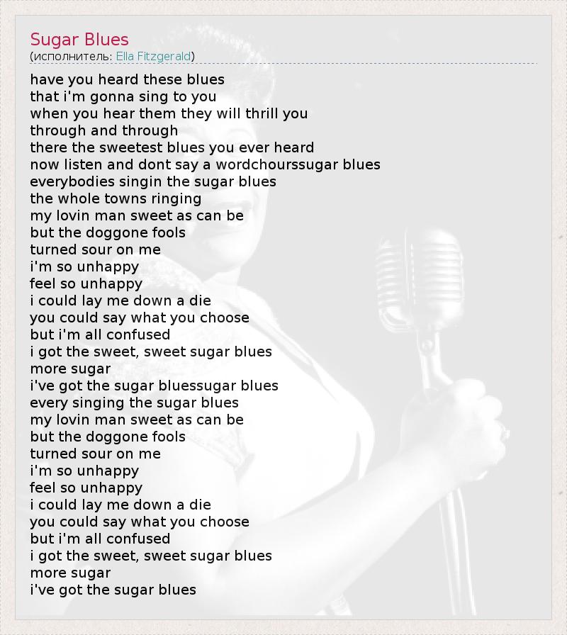 have you heard these blues that i'm gonna sing to you when you hear them they will thrill you through and through there the sweetest blues you ever heard now listen and dont say a wordchourssugar blues everybodies singin the sugar blues the whole towns ringing my lovin man sweet as can be but the doggone fools turned sour on me i'm so unhappy feel so unhappy i could lay me down a die you could say what you choose but i'm all confused i got the sweet, sweet sugar blues more sugar i've got the sugar bluessugar blues every singing the sugar blues my lovin man sweet as can be but the doggone fools turned sour on me i'm so unhappy feel so unhappy i could lay me down a die you could say what you choose but i'm all confused i got the sweet, sweet sugar blues more sugar i've got the sugar blues