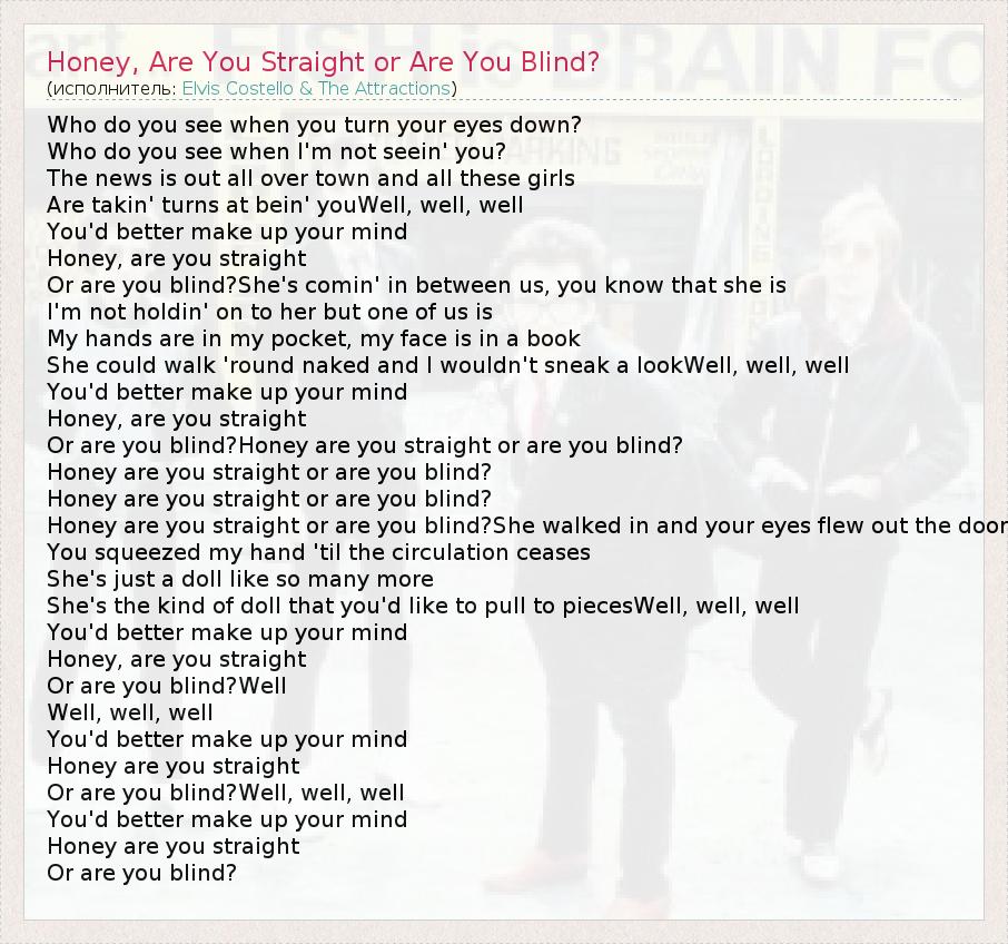 Who do you see when you turn your eyes down? Who do you see when I'm not seein' you? The news is out all over town and all these girls Are takin' turns at bein' youWell, well, well You'd better make up your mind Honey, are you straight Or are you blind?She's comin' in between us, you know that she is I'm not holdin' on to her but one of us is My hands are in my pocket, my face is in a book She could walk 'round naked and I wouldn't sneak a lookWell, well, well You'd better make up your mind Honey, are you straight Or are you blind?Honey are you straight or are you blind? Honey are you straight or are you blind? Honey are you straight or are you blind? Honey are you straight or are you blind?She walked in and your eyes flew out the door You squeezed my hand 'til the circulation ceases She's just a doll like so many more She's the kind of doll that you'd like to pull to piecesWell, well, well You'd better make up your mind Honey, are you straight Or are you blind?Well Well, well, well You'd better make up your mind Honey are you straight Or are you blind?Well, well, well You'd better make up your mind Honey are you straight Or are you blind?