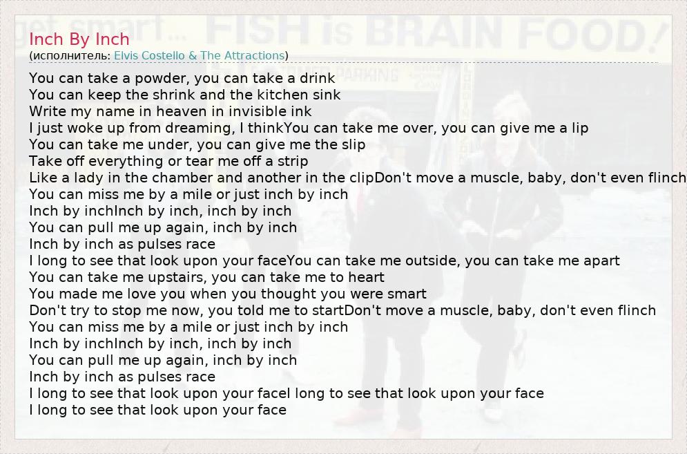 You can take a powder, you can take a drink You can keep the shrink and the kitchen sink Write my name in heaven in invisible ink I just woke up from dreaming, I thinkYou can take me over, you can give me a lip You can take me under, you can give me the slip Take off everything or tear me off a strip Like a lady in the chamber and another in the clipDon't move a muscle, baby, don't even flinch You can miss me by a mile or just inch by inch Inch by inchInch by inch, inch by inch You can pull me up again, inch by inch Inch by inch as pulses race I long to see that look upon your faceYou can take me outside, you can take me apart You can take me upstairs, you can take me to heart You made me love you when you thought you were smart Don't try to stop me now, you told me to startDon't move a muscle, baby, don't even flinch You can miss me by a mile or just inch by inch Inch by inchInch by inch, inch by inch You can pull me up again, inch by inch Inch by inch as pulses race I long to see that look upon your faceI long to see that look upon your face I long to see that look upon your face