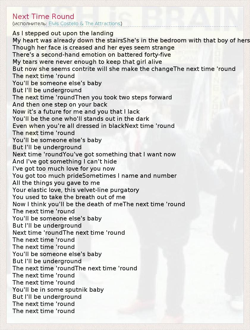 As I stepped out upon the landing My heart was already down the stairsShe's in the bedroom with that boy of hers Though her face is creased and her eyes seem strange There's a second-hand emotion on battered forty-five My tears were never enough to keep that girl alive But now she seems contrite will she make the changeThe next time 'round The next time 'round You'll be someone else's baby But I'll be underground The next time 'roundThen you took two steps forward And then one step on your back Now it's a future for me and you that I lack You'll be the one who'll stands out in the dark Even when you're all dressed in blackNext time 'round The next time 'round You'll be someone else's baby But I'll be underground Next time 'roundYou've got something that I want now And I've got something I can't hide I've got too much love for you now You got too much prideSometimes I name and number All the things you gave to me Your elastic love, this velvet-line purgatory You used to take the breath out of me Now I think you'll be the death of meThe next time 'round The next time 'round You'll be someone else's baby But I'll be underground Next time 'roundThe next time 'round The next time 'round The next time 'round You'll be someone else's baby But I'll be underground The next time 'roundThe next time 'round The next time 'round The next time 'round You'll be in some sputnik baby But I'll be underground The next time 'round The next time 'round