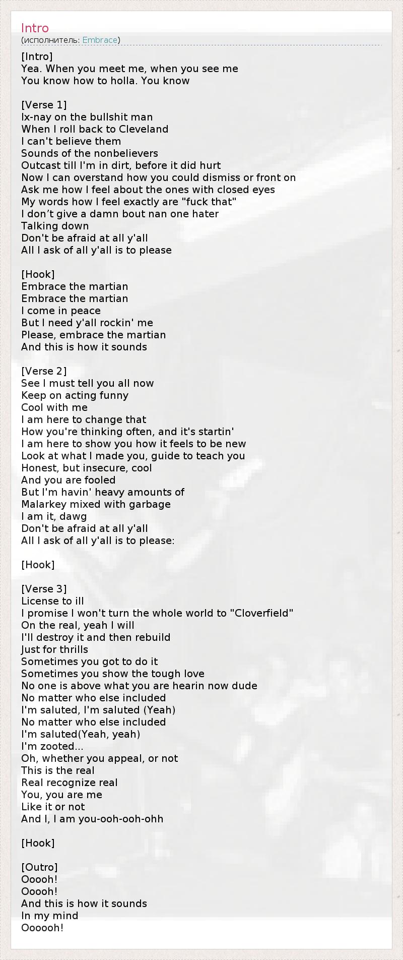 Это интересно:Существует несколько групп с названием Embrace:1) легендарная post-hardcore-формация Embrace из Вашингтона просуществовала не так долго (лето 1985 - весна 1986), но оказала действительно огромное влияние на эмоциональный хардкор и всю хардкор/панк-сцену. На вокале в группе был небезызвестный Ian MacKaye (Minor Threat), и три бывших участника The Faith - гитарист Michael Hampton, ударник Ivor Hanson, и басист Chris Bald. Из записаных... продолжение