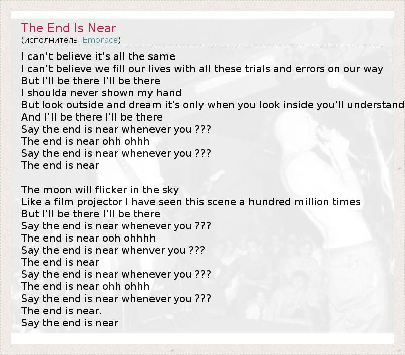I can't believe it's all the same I can't believe we fill our lives with all these trials and errors on our way But I'll be there I'll be there I shoulda never shown my hand But look outside and dream it's only when you look inside you'll understand And I'll be there I'll be there Say the end is near whenever you ??? The end is near ohh ohhh Say the end is near whenever you ??? The end is near The moon will flicker in the sky Like a film projector I have seen this scene a hundred million times But I'll be there I'll be there Say the end is near whenever you ??? The end is near ooh ohhhh Say the end is near whenver you ??? The end is near Say the end is near whenever you ??? The end is near ohh ohhh Say the end is near whenever you ??? The end is near. Say the end is near