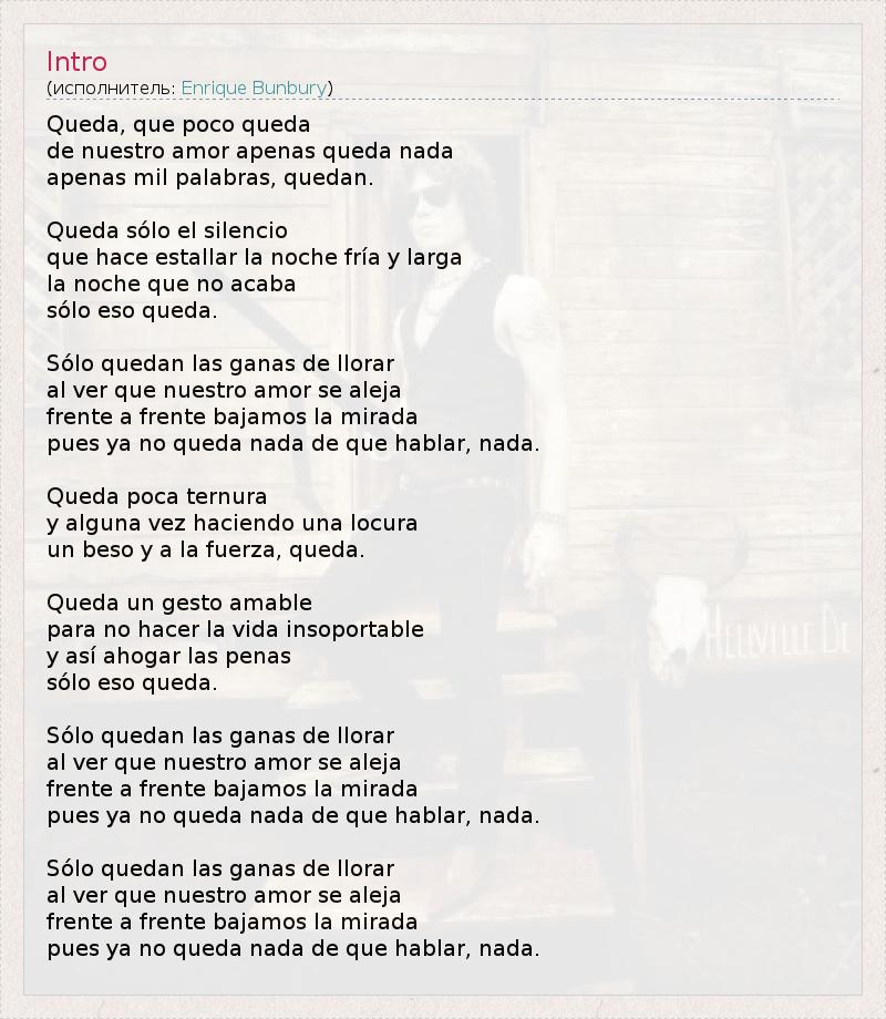 Это интересно:Enrique Bunbury - Энрике Бунбури (полное имя - Enrique Ortiz de Landázuri Izardui) родился 11 августа 1967 года в Сарагосе (Испания). В молодости входил в составы разных групп (Apocalipsis, Niños del Brasil, Rebel Waltz, Proceso Entrópico), но более всего известен как вокалист испанской рок-группы Héroes del silencio (группа распалась в 1996, но в 2007 воссоединилась ради мирового юбилейного турне).В списке "250 лучших альбомов ибероамериканоского... продолжение