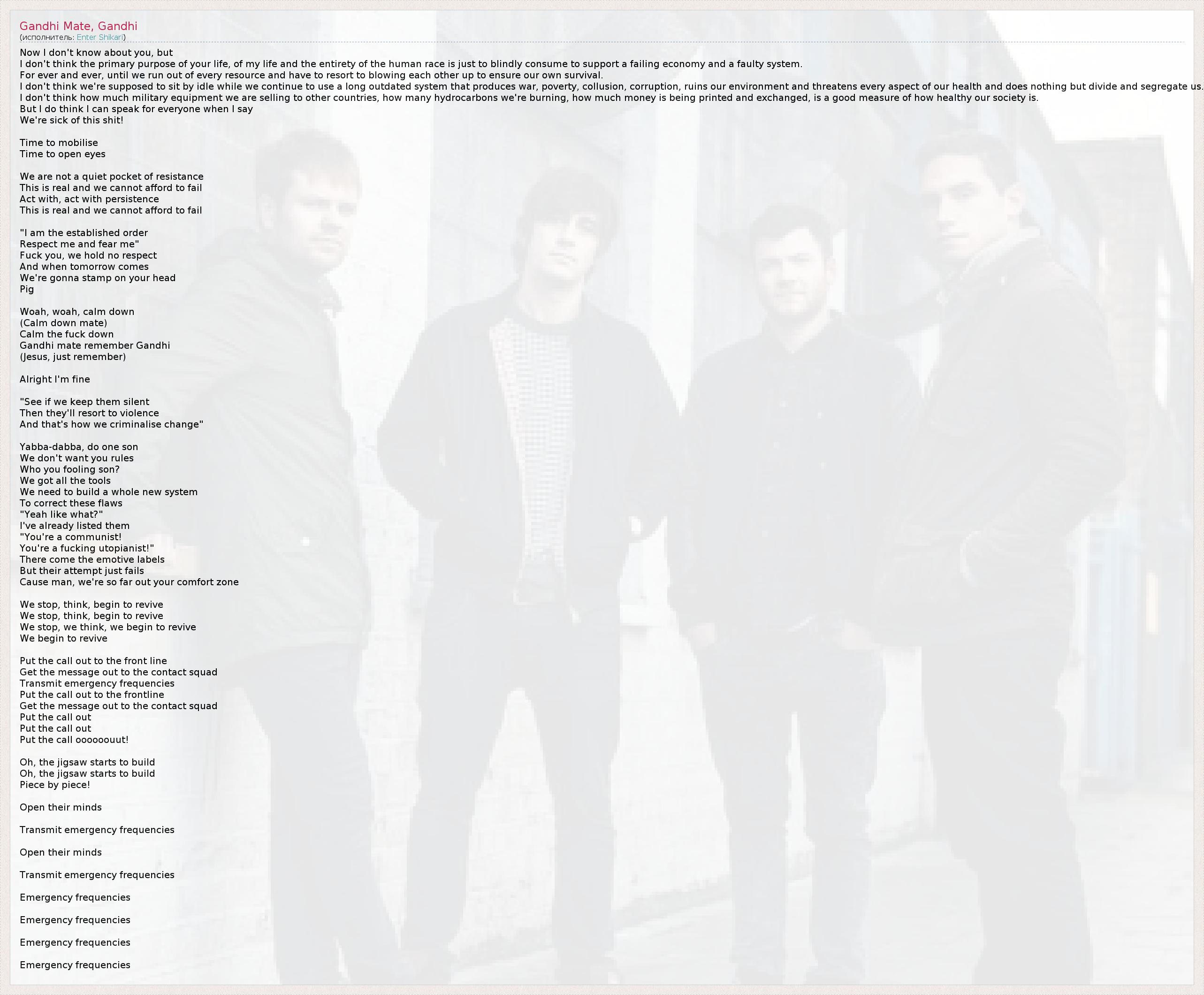 Now I don't know about you, but I don't think the primary purpose of your life, of my life and the entirety of the human race is just to blindly consume to support a failing economy and a faulty system. For ever and ever, until we run out of every resource and have to resort to blowing each other up to ensure our own survival. I don't think we're supposed to sit by idle while we continue to use a long outdated system that produces war, poverty, collusion, corruption, ruins our environment and threatens every aspect of our health and does nothing but divide and segregate us. I don't think how much military equipment we are selling to other countries, how many hydrocarbons we're burning, how much money is being printed and exchanged, is a good measure of how healthy our society is. But I do think I can speak for everyone when I say We're sick of this shit! Time to mobilise Time to open eyes We are not a quiet pocket of resistance This is real and we cannot afford to fail Act with, act with persistence This is real and we cannot afford to fail "I am the established order Respect me and fear me" Fuck you, we hold no respect And when tomorrow comes We're gonna stamp on your head Pig Woah, woah, calm down (Calm down mate) Calm the fuck down Gandhi mate remember Gandhi (Jesus, just remember) Alright I'm fine "See if we keep them silent Then they'll resort to violence And that's how we criminalise change" Yabba-dabba, do one son We don't want you rules Who you fooling son? We got all the tools We need to build a whole new system To correct these flaws "Yeah like what?" I've already listed them "You're a communist! You're a fucking utopianist!" There come the emotive labels But their attempt just fails Cause man, we're so far out your comfort zone We stop, think, begin to revive We stop, think, begin to revive We stop, we think, we begin to revive We begin to revive Put the call out to the front line Get the message out to the contact squad Transmit emergency frequencies Put the call out to the frontline Get the message out to the contact squad Put the call out Put the call out Put the call oooooouut! Oh, the jigsaw starts to build Oh, the jigsaw starts to build Piece by piece! Open their minds Transmit emergency frequencies Open their minds Transmit emergency frequencies Emergency frequencies Emergency frequencies Emergency frequencies Emergency frequencies