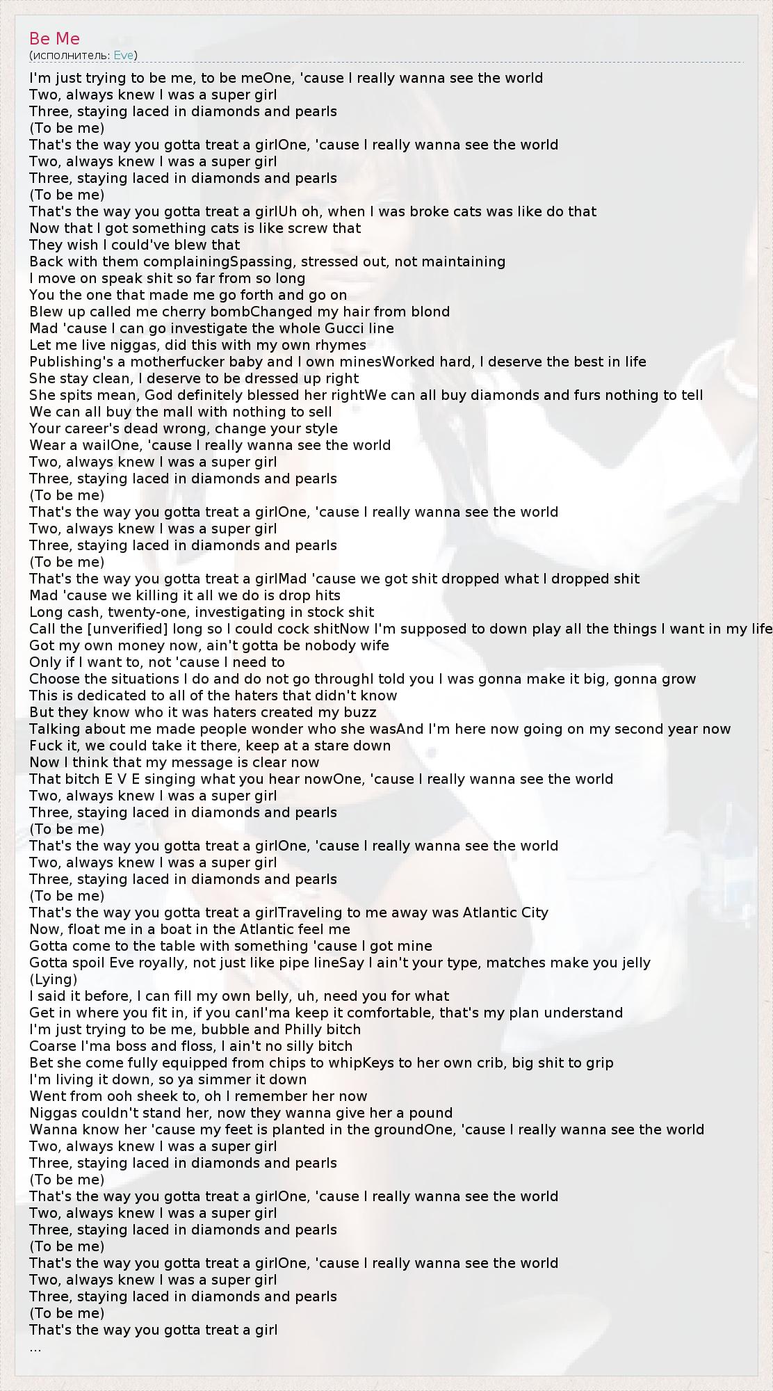 That bitch E V E singing what you hear nowOne, 'cause I really wanna see the world