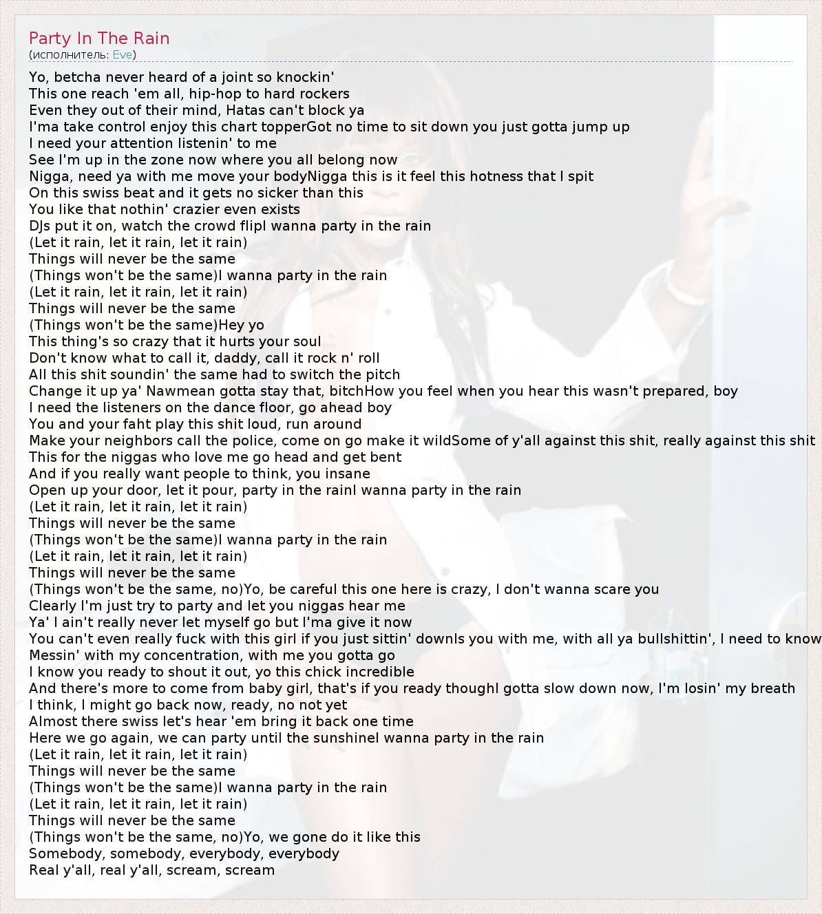 Yo, betcha never heard of a joint so knockin' This one reach 'em all, hip-hop to hard rockers Even they out of their mind, Hatas can't block ya I'ma take control enjoy this chart topperGot no time to sit down you just gotta jump up I need your attention listenin' to me See I'm up in the zone now where you all belong now Nigga, need ya with me move your bodyNigga this is it feel this hotness that I spit On this swiss beat and it gets no sicker than this You like that nothin' crazier even exists DJs put it on, watch the crowd flipI wanna party in the rain (Let it rain, let it rain, let it rain) Things will never be the same (Things won't be the same)I wanna party in the rain (Let it rain, let it rain, let it rain) Things will never be the same (Things won't be the same)Hey yo This thing's so crazy that it hurts your soul Don't know what to call it, daddy, call it rock n' roll All this shit soundin' the same had to switch the pitch Change it up ya' Nawmean gotta stay that, bitchHow you feel when you hear this wasn't prepared, boy I need the listeners on the dance floor, go ahead boy You and your faht play this shit loud, run around Make your neighbors call the police, come on go make it wildSome of y'all against this shit, really against this shit This for the niggas who love me go head and get bent And if you really want people to think, you insane Open up your door, let it pour, party in the rainI wanna party in the rain (Let it rain, let it rain, let it rain) Things will never be the same (Things won't be the same)I wanna party in the rain (Let it rain, let it rain, let it rain) Things will never be the same (Things won't be the same, no)Yo, be careful this one here is crazy, I don't wanna scare you Clearly I'm just try to party and let you niggas hear me Ya' I ain't really never let myself go but I'ma give it now You can't even really fuck with this girl if you just sittin' downIs you with me, with all ya bullshittin', I need to know Messin' with my concentration, with me you gotta go I know you ready to shout it out, yo this chick incredible And there's more to come from baby girl, that's if you ready thoughI gotta slow down now, I'm losin' my breath I think, I might go back now, ready, no not yet Almost there swiss let's hear 'em bring it back one time Here we go again, we can party until the sunshineI wanna party in the rain (Let it rain, let it rain, let it rain) Things will never be the same (Things won't be the same)I wanna party in the rain (Let it rain, let it rain, let it rain) Things will never be the same (Things won't be the same, no)Yo, we gone do it like this Somebody, somebody, everybody, everybody Real y'all, real y'all, scream, scream