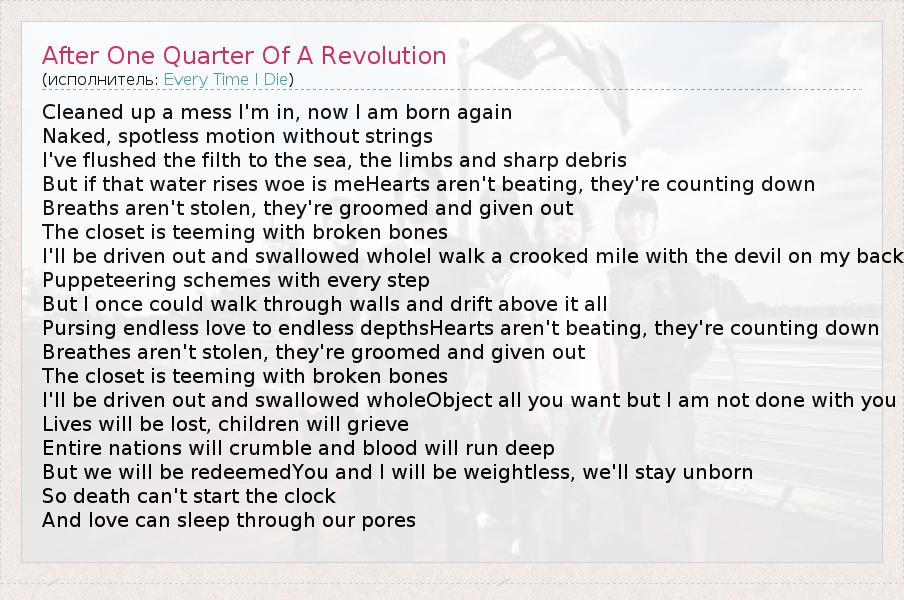 ГлавнаяИсполнителиEvery Time I DieAfter One Quarter Of A Revolution