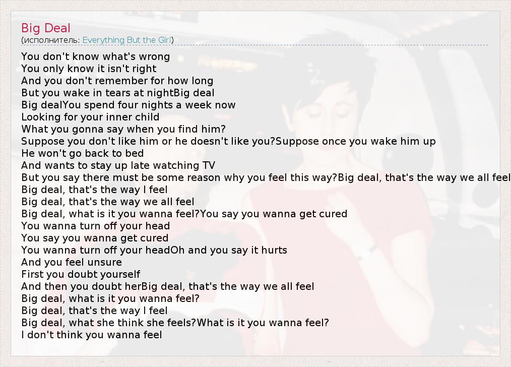 Это интересно:Everything but the Girl — британский дуэт, образованный в городе Халле (Kingston upon Hull) в 1982 году вокалисткой и гитаристкой Трейси Торн (англ. Tracey Thorn; род. 26 сент. 1962 г.) и музыкантом, композитором и вокалистом Бэном Уоттом (англ. Ben Watt; род. 6 дек. 1962 г.). Всемирная известность к дуэту пришла после того, как американский электронный музыкант, ди-джей и продюсер Тод Терри (англ. - Todd Terry)... продолжение